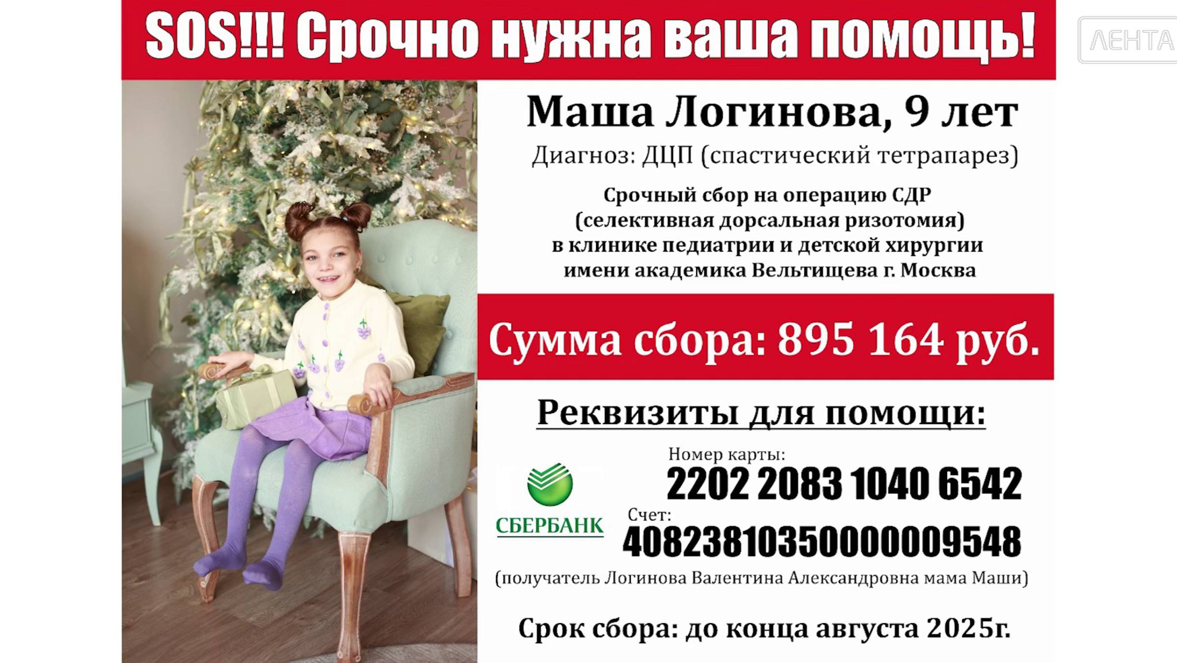 Девочке 9 лет, она страдает ДЦП и сопутствующими заболеваниями. Маша находиться в состоянии после оперативной коррекции паралитического вывиха левого и правого бедра, паралитических контрактур. Маше требуется операция селективная дорсальная ризотомия, в клинике педиатрии и детской хирургии имени академика Вельтищева, город Москва. На лечения Маши необходимо сумма 895.164 рубля. Таких денег у семьи нет. Мама, Валентина Александровна, просит помощи у Вас, дорогие телезрители. Всех неравнодушных людей просьба откликнуться. Срок сбора материальной помощи до конца августа 2025 года. Реквизиты для помощи Вы видите на своем экране. Сбербанк, номер карты: 2202 2083 1040 6542 Счет: 4082 3810 3500 0000 9548 (получатель Логинова Валентина Александровна мама Маши)