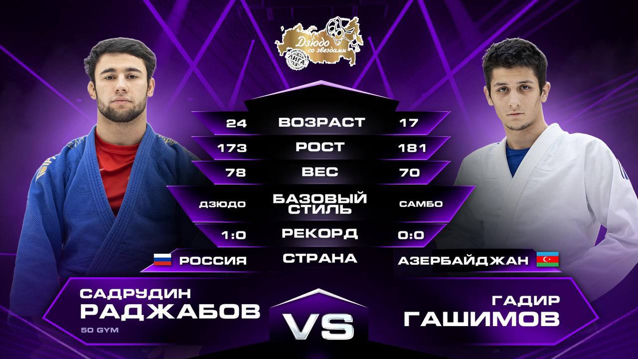 Лига Дзюдо со Звёздами - первая в мире борцовская организация на базе дзюдо, объединяющая все стили борьбы. Сезон 3. Садрудин Раджабов VS Гашимов Гадир Садрудин Раджабов - дзюдо, многократный призер Всероссийских турниров. Гашимов Гадир - самбо, боевое самбо, чемпион Москвы.