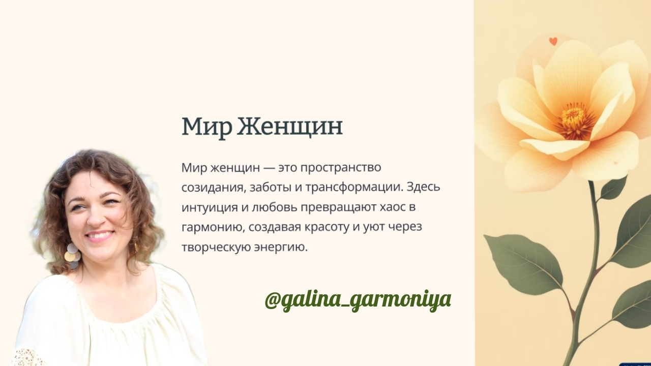Здравствуй, дорогая Женщина. Женщины ищут Гармонию. Но мы живём в мире Мужчин, где борьба, конкуренция, агрессия. А мир Женщин — другой. Созидательный. Как сказка. Когда Женщина живёт в неестественных условиях, она начинает выполнять мужские роли. Отсюда конфликты в паре, с детьми, с собой. В этом вебинаре я говорю о том: 🌿 Почему некоторые не хотят выходить из «болота» 🌿 Как дисбаланс чакр влияет на жизнь (деньги, отношения, дух) 🌿 Что такое настоящая любовь к Роду (не слова, а действие) 🌿 Как устроена Школа «Пробуждение Себя» (5 классов, 3 уровня работы) Если ты чувствуешь, что готова жить иначе — я приглашаю тебя. Мы не перетягиваем друг друга из мира в мир. Мы просто показываем: можно жить в Гармонии. Программа Школы: 5 классов. Каждый включает: → Вебинар (мировоззрение) → Практика (внедрение в жизнь) → Медитация (исцеление на энергетическом уровне) Узнать подробности: https://galinagarmoniya.tilda.ws/completeness Таймкоды: 00:00 — Мир Женщины 03:07 — Мир Мужчины 05:27 — Пропасть между Женщиной в саморазвитии и тем, кто сидит "в болоте" 08:19 — Притча о болоте 10:39 - Как жить в Гармонии 18:58 — 7 Чакр = 7 Уровней Жизни 34:17 — Школа «Пробуждение Себя» Запись вебинара 2020, обновлена презентация Обнимаю Любовью, твоя Гармония ❤️