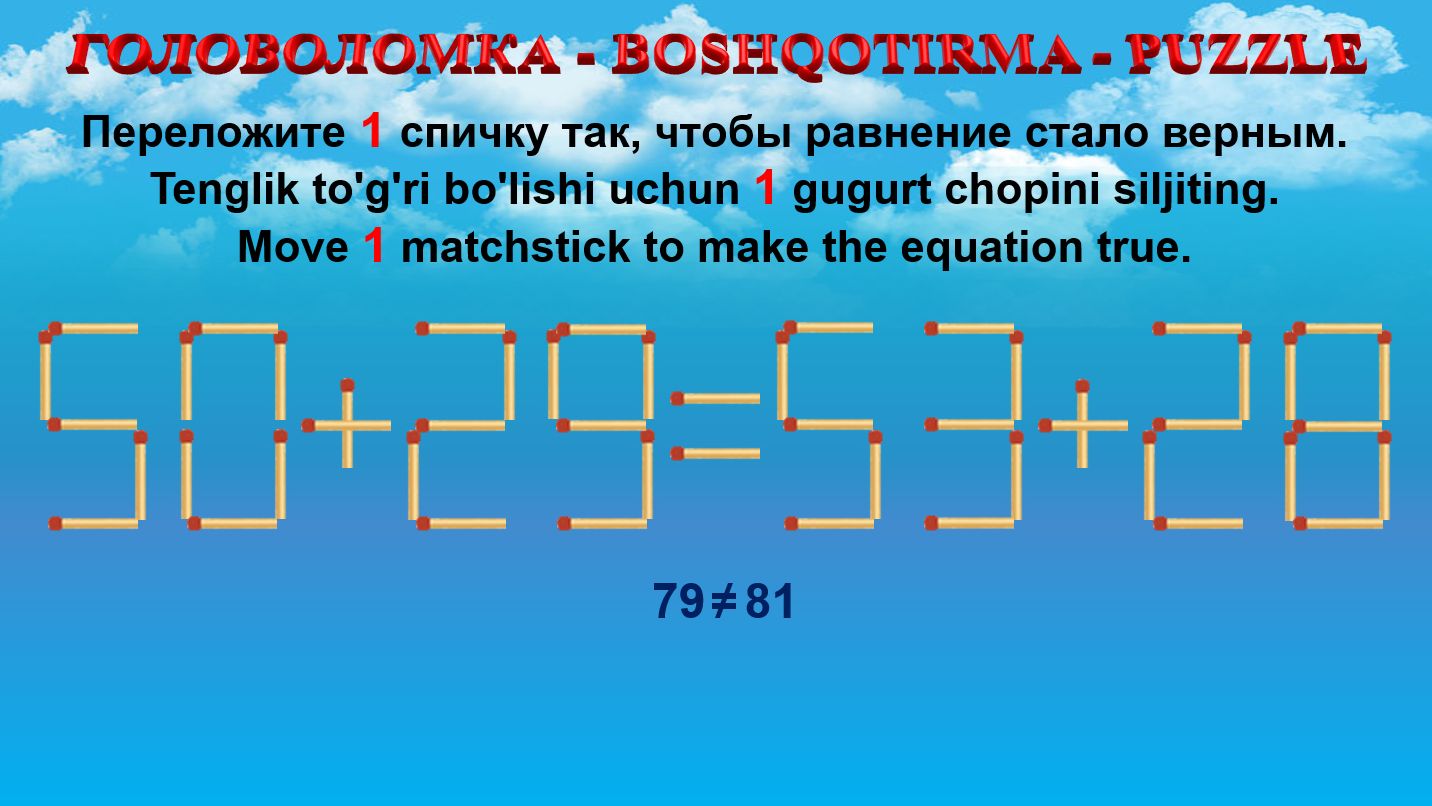 ГОЛОВОЛОМКА - BOSHQOTIRMA – PUZZLE. Спичка. 50+29=53+28, 62+23=59+22, 54+23=50+39, 55+29=50+36