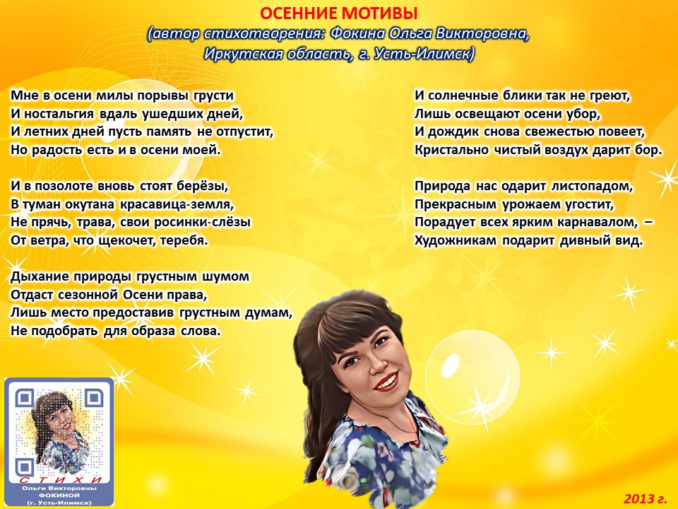 Читает автор стихотворения: ФОКИНА ОЛЬГА ВИКТОРОВНА (Иркутская область, город Усть-Илимск) СТИХИ: https://stihi.ru/2018/07/08/3790 БИОГРАФИЯ: http://www.proza.ru/2019/10/08/1473 ВЫИГРЫВАЙТЕ КНИГИ БЕСПЛАТНО: https://proza.ru/2017/09/17/447 ОТЗЫВЫ ЧИТАТЕЛЕЙ: http://www.proza.ru/2019/11/29/611 Из книги Фокиной Ольги Викторовны (Усть-Илимск) «Несу добро в ладошках!»: [все стихотворения с 2005 по октябрь 2020 гг., проза, авторские песни, интервью]. – Москва: МГО Союза писателей России, 2020 г. – 886 стр., ил. ISBN 978-5-7949-0826-8 ОСЕННИЕ МОТИВЫ (автор стихотворения: Фокина Ольга Викторовна, Иркутская область, г. Усть-Илимск) Мне в осени милы порывы грусти И ностальгия вдаль ушедших дней, И летних дней пусть память не отпустит, Но радость есть и в осени моей. И в позолоте вновь стоят берёзы, В туман окутана красавица-земля, Не прячь, трава, свои росинки-слёзы От ветра, что щекочет, теребя. Дыхание природы грустным шумом Отдаст сезонной Осени права, Лишь место предоставив грустным думам, Не подобрать для образа слова. И солнечные блики так не греют, Лишь освещают осени убор, И дождик снова свежестью повеет, Кристально чистый воздух дарит бор. Природа нас одарит листопадом, Прекрасным урожаем угостит, Порадует всех ярким карнавалом, – Художникам подарит дивный вид. 16 сентября 2013 г.