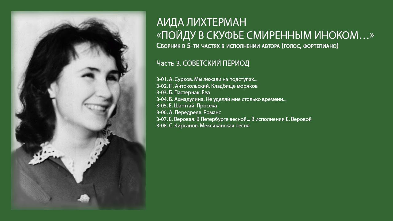 Аида Лихтерман «Пойду в скуфье смиренным иноком…». Сборник песен в 5-ти частях в исполнении автора (голос, фортепиано). От автора: Материалом для создания этого «звучащего» сборника послужили рабочие аудиозаписи песен, появившихся в давние уже времена – 60-е – 80-е годы 20 столетия, певшихся тогда в кругу друзей под фортепиано, хранившихся в моей памяти, всегда готовых к их воспроизведению. Некоторые песни этого сборника присутствуют в нотном изложении в моих сборниках – учебных пособиях для музыкального развития детей: «Песенки-картинки», «Мэг Меррилиз», «Поэзия. ХХ век. Россия» издательства «Композитор», Санкт-Петербург, 2018–2019 гг. Этот сборник дополняет эти учебные пособия возможностью услышать ряд песен в авторском исполнении. Краткое содержание: Часть 1. СЕРГЕЙ ЕСЕНИН – https://youtu.be/SV5sWWmZ1j8 Часть 2. А. С. ПУШКИН, М. Ю. ЛЕРМОНТОВ, И. А. БУНИН – https://youtu.be/PerIEhrIsP8 Часть 3. СОВЕТСКИЙ ПЕРИОД Часть 4. Ш. БОДЛЕР, Р. КИПЛИНГ, У. БЛЕЙК, ЛИ БО – https://youtu.be/laGo0HrbA0o Часть 5. ДЕТСКИЕ ПЕСЕНКИ – https://youtu.be/wuywMYRGkrc Часть 3. СОВЕТСКИЙ ПЕРИОД 0:00:15 3-01. А. Сурков. Мы лежали на подступах... 0:04:17 3-02. П. Антокольский. Кладбище моряков 0:08:16 3-03. Б. Пастернак. Ева 0:12:33 3-04. Б. Ахмадулина. Не уделяй мне столько времени... 0:15:03 3-05. Е. Шантгай. Просека 0:18:57 3-06. А. Передреев. Романс 0:24:56 3-07. Е. Веровая. В Петербурге весной... В исполнении Е. Веровой 0:29:23 3-08. С. Кирсанов. Мексиканская песня В заключение – будто бы некстати, но с мыслью: дабы не пропали они для мира – я привожу два стихотворения поэта Владимира Чистякова из его машинописной подборки с пометой «Владимир Чистяков. 1968 год», оставленной им в моём доме и переданной в 2017 году в архив Аллы Левитан. * * * Я говорил с тобой пока лишь из того соображенья, как в море смотрят облака, своё увидев отраженье. И хоть расплывчато порой твоё суждение, но всё же твой голос сыплет серебро, с капелью мартовскою схоже. И ты не копишь здравый смысл, не прикрываешься рассудком… Пускай твоя похожа мысль на маленькую незабудку. Она свежа. И потому меня к тебе всё время тянет, как тянет нас к цветку тому, что даже в засуху не вянет. * * * Я не писал тебе давно, и все слова забылись, на нашем чердаке окно покрылось слоем пыли. Я напишу письмо на нём всего лишь в четверть рамы уверенный, что всё равно читать никто не станет. И только солнышко, с трудом просвечивая в буквах, перепечатает его расплывчато и смутно. Монтаж – Алла Левитан.