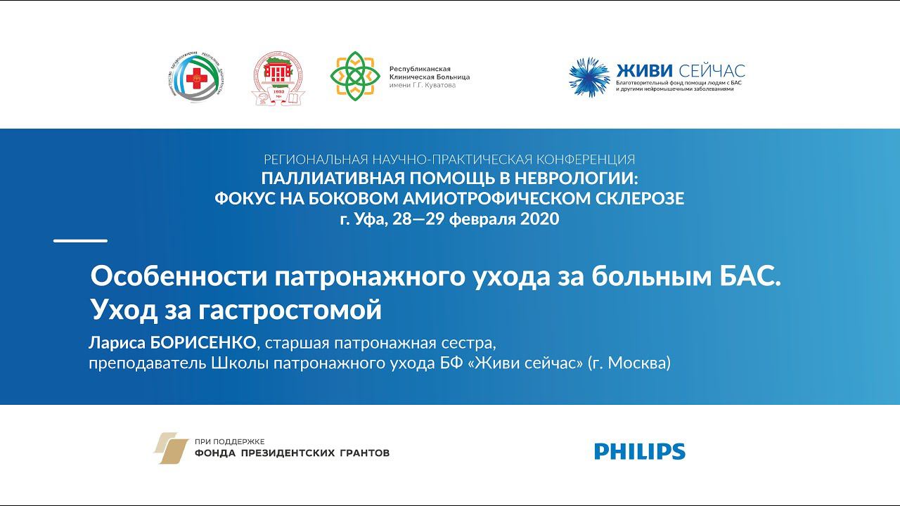 Спикер: Борисенко Лариса Геннадьевна, старшая патронажная медсестра, преподаватель по уходу за больными БАС для родственников и сиделок БФ «Живи сейчас», (г. Москва). «Паллиативная помощь в неврологии: фокус на боковом амиотрофическом склерозе» — это серия научно-практических конференций, инициатором и организатором которых является благотворительный фонд помощи людям с БАС «Живи сейчас» при содействии Ассоциации профессиональных участников хосписной помощи. Научно-практическая конференция фонда «Живи сейчас» реализуется в рамках проекта «Повышение качества и доступности паллиативной помощи пациентам с боковым амиотрофическим склерозом (БАС)» при поддержке Фонда президентских грантов. Страница конференции: http://als-info.ru/neuro-regions/ Поддержать фонд можно по ссылке: https://alsfund.ru/campaign/pomoch-fondu/