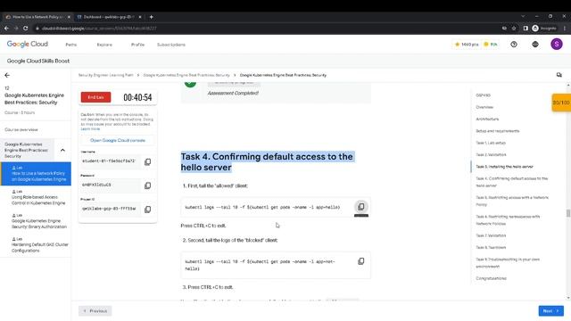 00:00 Task 1. Lab setup 03:29 Task 2. Validation 04:43 Task 3. Installing the hello server 05:15 Task 4. Confirming default access to the hello server 05:39 Task 5. Restricting access with a Network Policy 07:06 Task 6. Restricting namespaces with Network Policies 09:32 Task 7. Validation 09:42 Task 8. Teardown 10:30 Task 9. Troubleshooting in your own environment https://www.cloudskillsboost.google/course_sessions/5563094/labs/408227