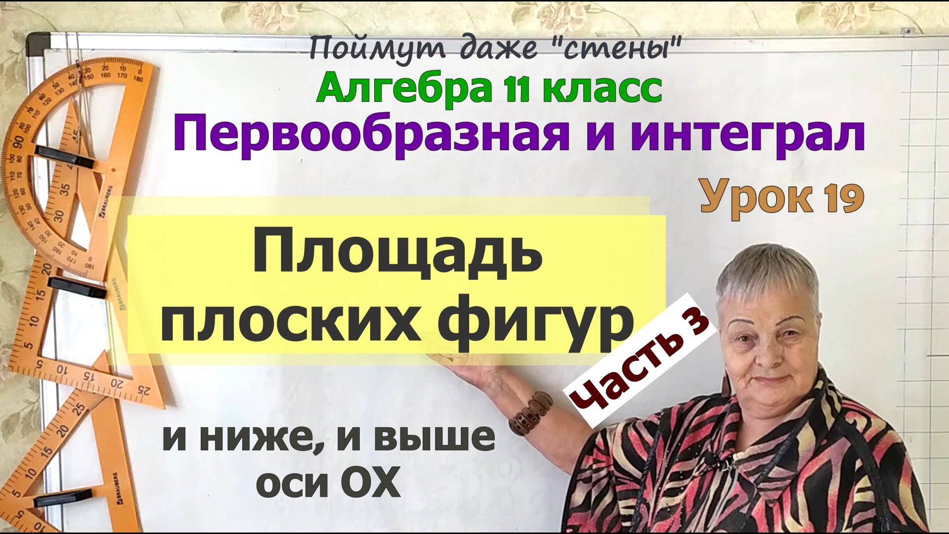 Алгебра 11 класс. Как вычислить площади плоских фигур, ограниченных заданными линиями с помощью определенного интеграла? Сегодня мы закончим отвечать на этот вопрос. Научим Вас находить площади плоских фигур, когда плоские фигуры расположены на координатной плоскости и ВЫШЕ, и НИЖЕ оси абсцисс. Покажем Вам два варианта решения подобных задач. 00:00 Начало видео. 00:53 Начнём с повторения. Фигура выше оси абсцисс. 02:33 А если фигура ниже оси абсцисс? Решение 1. 06:35 А если фигура ниже оси абсцисс? Решение 2. 13:19 А если фигура и выше, и ниже оси абсцисс? 13:55 Решение 1. 16:01 Решение 2. Рекомендуем посмотреть следующие видео: Площадь плоских фигур с помощью определенного интеграла. Часть 1. Алгебра 11 класс https://rutube.ru/video/9b992587e6b0ca9cad5ad13a607001d4/ Площадь плоских фигур с помощью определенного интеграла. Часть 2. Алгебра 11 класс https://rutube.ru/video/057d114e2dc0cf08135d77aae753f773/ Криволинейная трапеция. Определение и примеры. Алгебра 11 класс https://rutube.ru/video/a7a739334cb66ceed322b0d95bc7e505/ Площадь плоских фигур с помощью определенного интеграла. Часть 3. Алгебра 11 класс https://rutube.ru/video/057d114e2dc0cf08135d77aae753f773/ Как определить координаты точек пересечения графиков двух функций (5 урок из 5). https://rutube.ru/video/37b63a5bf56d244adadaaeb5b50c879b/ #площадьплоскихфигур #площадьфигурыограниченнойлиниями #алгебра11класс #МатематикаОтБаканчиковой Алгебра 11 класс, площадь плоских фигур, площадь фигуры ограниченной линиями