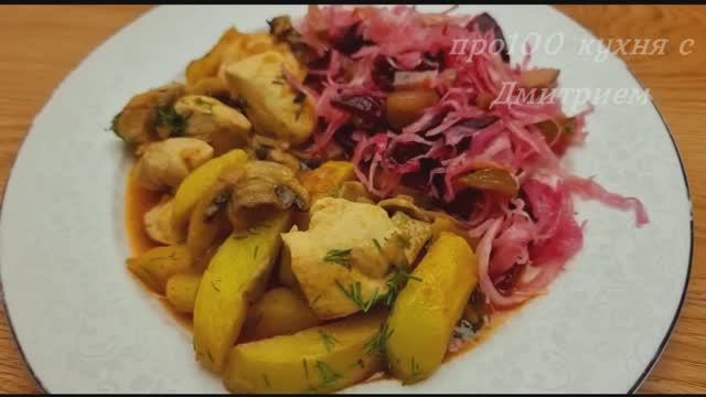 Приготовление и ингредиенты: Лук. 4 картофелины. 2 куриных филе. Растительное масло. Жарить 5-7 минут на среднем огне. Растительное масло. Жарить 3-4 минуты на среднем огне. Обжарить картофель до золотистой корочки. 6 грибов. Жарить грибы на среднем огне 7-8 минут. 2 столовые ложки томатной пасты на 200 мл воды. Соль, черный перец, перец. Отварить 1 свеклу. 4 консервированных огурца. 100г квашеной капусты. Соль, масло растительное. Укроп. Приятного аппетита!