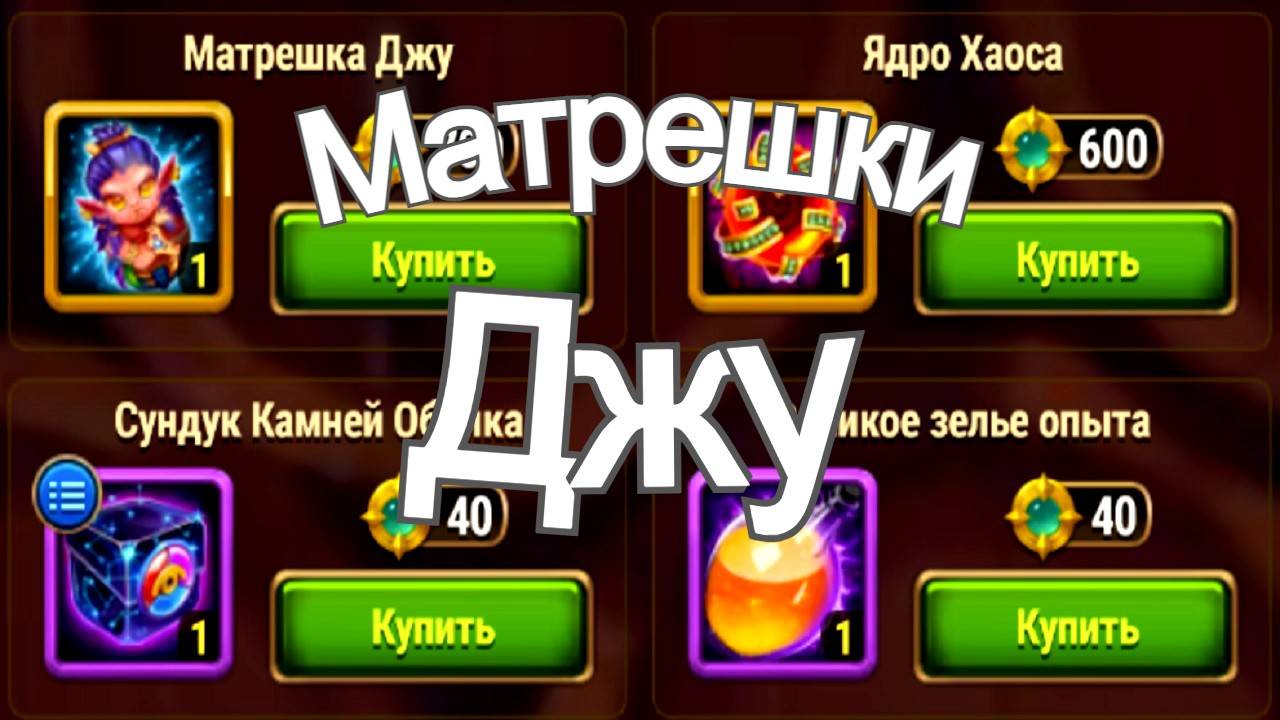 Хроники Хаоса Матрешки Джу открываю, что содержат Ивент на прокачку героя Джу в игре Хроники Хаоса, Открываю Матрешки Джу, смотрим что и в каком количестве из них поступает. Из некоторых матрешек выпадает по 2 таких же матрешки, камни Джу, энергия и другие ресурсы. Удачи в делах, отличного настроения и приятного просмотра. Можете оценить видео лайком (дизлайком) и высказывать ваше мнение в комментариях. Много интересной и полезной информации на канале Хроники Хаоса Александр Ларин Hero-Wars