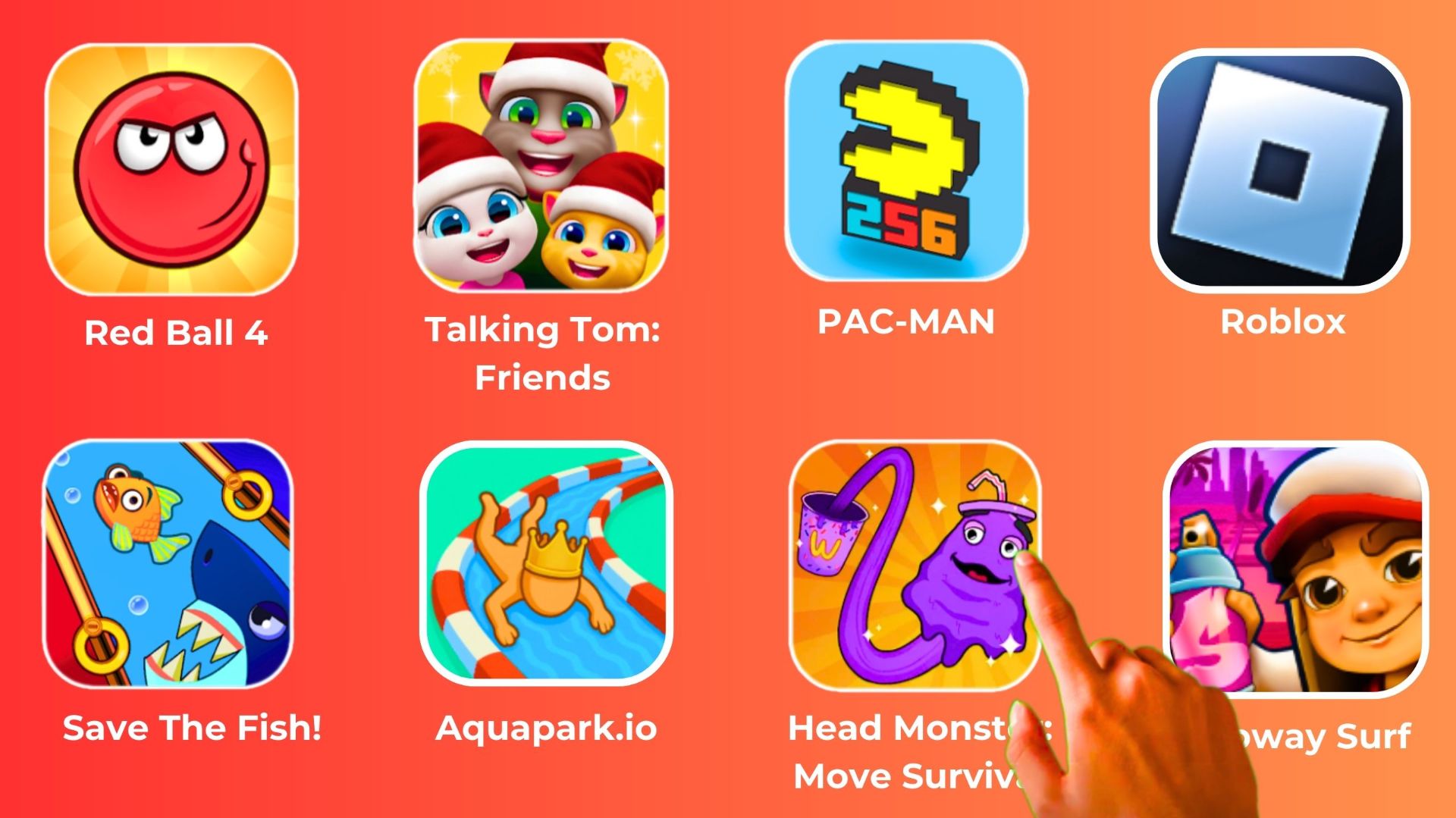 Talking Tom_ Friends,Red Ball 4,PAC-MAN,Roblox,Save The Fish!,Aquapark.io,Head Monster,Subway Surf.