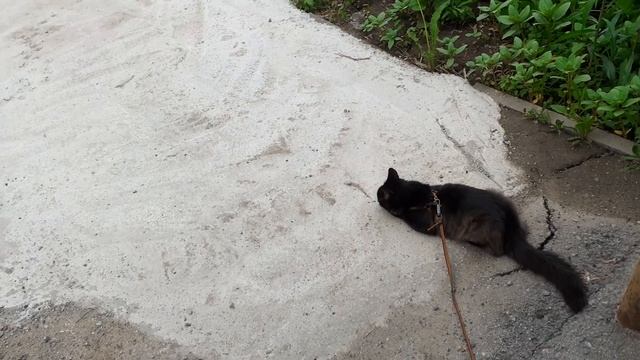 Гуляет котик возле дома, прилег отдохнуть возле подьезда.