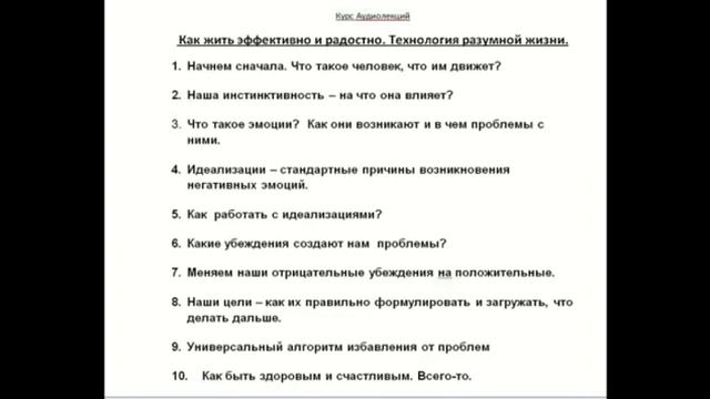 Как жить эффективно и радостно. Аудиолекции Александр Свияш - http://psymarket.ru/catalog/treningi_aleksandra_sviyasha/audiolektsii_ot_aleksandra_sviyasha_kak_zhit_effektivno_i_radostno/?id=618 Или заходите в наш магазин www.psymarket.ru и жмите на кнопку "Аудиокниги". Иногда я задумываюсь над тем, чем я занимаюсь. То ли я занимаюсь бизнесом, то ли просто развлекаюсь, то ли исследованиями занимаюсь, то ли стараюсь помочь людям. И чем больше я на эту тему думаю, тем больше я понимаю, что истинным мотивом, призванием что ли моим, является помощь людям. Помочь людям жить более радостно, более успешно, более счастливо в том странном мире, в котором мы пребываем. Я считаю, что я даю людям очень разумные идеи, как им успешно жить в нашем очень неоднозначном мире, и стараюсь им давать всеми доступными способами. Книгами, открываю сайты разные и вот возникла идея сделать цикл аудио лекций. Этот цикл лекций называется "Как жить эффективно, радостно -- технология разумной жизни". Он состоит из 10-ти лекций. Там я последовательно прохожу по всем темам, которые помогут Вам понять, где Вы находитесь сейчас. Куда Вам можно двигаться, и если Вас что-то в жизни не устраивает, то каким образом Вам нужно поступать, какие шаги следует сделать. Если у Вас, хоть иногда бывает свободное время, то рекомендую Вам прослушать этот цикл лекций. Я бы с удовольствием отдал бы Вам эти лекции бесплатно, но только для того, чтобы они добрались до Вас, нужно иметь некий персонал, штат людей, которые занимаются распространением видео и аудио лекций, им нужна зарплата и так далее. Мы живём в материальном мире, поэтому конечно приходится назначать на них некоторую цену. Ну, таков наш мир и то, что даётся бесплатно обычно люди не ценят. В общем, они полезны, они нужны, они помогут просветлению Вам, Вашим друзьям. В итоге, в нашем мире станет немножко больше улыбающихся людей, людей которые не трясутся от страха, потому что в мире происходят ужасные события. Если они не будут трястись, то их личном пространстве всё будет благополучно. Они не сядут в тот самолёт, который упадёт по непонятным пока причинам. Они не поедут в то место, где начнутся какие-то катастрофы. Даже если там начнутся катастрофы, то с ними ничего не случится. Я знаю это уже достаточно много лет, и те люди которые пользуются предложенным мною материалом, у них всё в жизни достаточно благополучно, успешно. Об этим свидетельствуют тысячи писем благодарности и всё остальное. Так что, друзья послушайте лекции и помогите тем, кто рядом с Вами тоже немножко стать более разумным, более позитивным, более успешным, более счастливым. Успеха Вам! www.psymarket.ru кнопка Аудиокниги