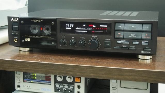 A&D GX-Z7000 ¥79,800(1987年頃) 高音質を追求しつつ実用的な機能のみを搭載した3ヘッドカセットデッキ。 GX-Z9000とは殆ど同じ構成となっていますが、キャプスタン駆動モーターがFGサーボDDモーターに変更され、dbx NRも非搭載となっています。また、シャーシ構造などの細かい点も変更されています。 録音ヘッドと再生ヘッドにはLC-OFC巻線スーパーGXヘッドを採用しています。 LC-OFC(線形結晶無酸素銅)は、無酸素銅の結晶を線状に引き伸ばしたもので、一般のタフピッチ銅に比べてコンデンサー効果をもつ結晶粒界の数が約7,500分の1に減少しています。さらに、亜鉛化銅(Cu2O)による整流作用(半導体)が無いというメリットも併せ持っています。このため、タフピッチ銅が多数のコンデンサーや半導体が連結したものと見なされるのに対し、LC-OFCはそれらを大きく改善し、伝送歪が著しく低減されています。特に信号電流レベルが微小な再生ヘッドでは解像力が大きく改善され、音楽のクリアネスを向上しています。 スーパーGXヘッドのコアには、高周波特性に優れたフェライトを独自の技術によって高精度加工して使用しています。これにより高域でのロスの少なさやワイドな周波数特性、低歪率といった音質面での特徴を得ています。その他にも、帯磁しにくい、耐摩耗性に優れている、ゴミが付着しにくい、テープとの摩擦による変調ノイズが少ないなどのメリットを得ています。 メカニズム部にはデュアルワイドテープガイドを備えたクローズドループ・ダブルキャプスタン方式を採用しています。 この方式では2本のキャプスタンとピンチローラーによってテープ走行をコントロールすることで、リールなどからの外乱をシャットアウトできワウフラッターが減少しています。また、テープスパンが短くなりテープの微振動が抑制できます。さらに、巻き始めから巻き終わりまでテープテンションが一定で安定したテープタッチが得られます。 特に長年培った独自のダブルキャプスタン方式ではシングルキャプスタンに比べて信号周波数から2kHz離れた周波数での変調ノイズが約5dBも改善するという優れた特性を得ています。 キャプスタン表面に独自の逆電ハードクロームメッキ処理が施されています。これによりテープグリップ力を高め、スリップ現象をほぼゼロに近づけ、ダブルキャプスタン方式のメリットをさらに高めています。 しかもこの処理法は耐摩耗性に優れているため、初期性能を長期にわたって維持できています。 独自のサイレントメカニズムを搭載することで優れた操作性と静粛さを実現しています。 マニュアルバイアスコントロール機能を搭載しています。 録音バイアス専用のスレーブバイアス発振回路の設置により、録音バイアス値を±20%の範囲でコントロールすることができています。 録音アンプ部は無帰還プッシュプル構成とし、さらに定電流駆動するドライブ方式を採用しています。 この構成とヘッドのドライブ能力によって高域のリニアリティが格段に向上しています。 再生イコライザーアンプ部にはシンプル&ストレートを基本コンセプトに開発したアンプを搭載しており、ツインアクティブ電源の効果ともあいまって高スルーレート、高安定度の動作を可能にしています。 電源部は信号系とメカニズム系を分離した構成となっており、電源回路間の相互干渉を防いでいます。 また、アンプ回路とノイズリダクション回路の電源をそれぞれ独立した±2電源としており、アンプ系に干渉を与えず濁りの無い音を得るとともに安定したドルビーNR/dbx NRのプロセシングを可能にしています。 録音・再生アンプ回路には独自のツインアクティブ電源を採用しています。 ツインアクティブ電源では、あらゆる帯域の電流変動に対しても安定した電力供給を維持するため、広帯域にわたる低出力インピーダンス化を実現しています。これにより大電流が要求される低域信号への応答性も改善されています。 ノイズリダクションシステムとしてドルビーB-C NRを搭載しています。ドルビーICは新開発の3ヘッド用ワンチップE(エンコード)/D(デコード)タイプを搭載しており、特性誤差による音質劣化を抑えています。 メカニズムを動作させるマイクロコンピューターの発生する高周波雑音成分の干渉を防ぐため、再生イコライザーアンプを銅めっきシールド板でシールドしています。さらに、EMI(電磁妨害)フィルターの挿入や独立巻線電源トランスなどの対策が講じられています。 また、電源からの高周波雑音成分を防ぐため、電源トランスにアイソレートスペーサーを採用しています。 トランジスタには増幅系から電源部までEBET(折返し電極トランジスタ)を使用しています。このEBETはスルーレイトに優れ、分解能の向上をもたらしています。 フィルムコンデンサーには音質的に吟味された西ドイツERO社などの高音質パーツを最適な箇所に配しています。 また、高周波の遮断や高域補償用のインダクター(コイル)には伝