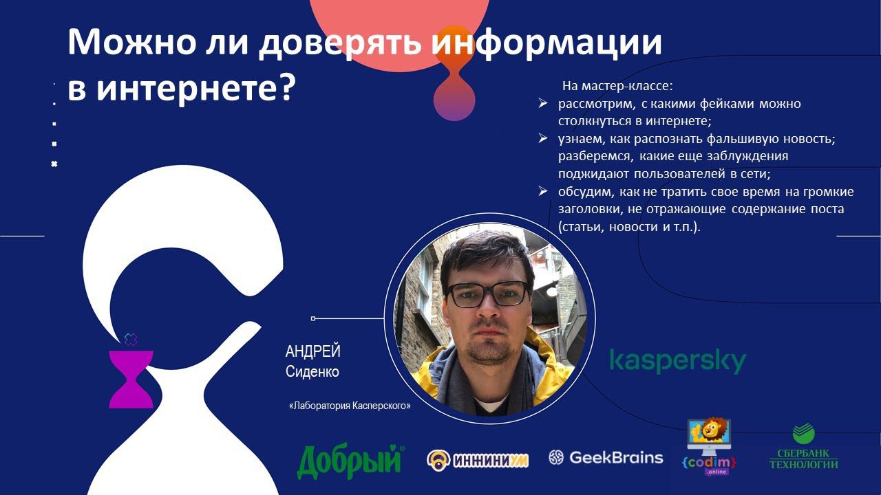 Мастер-класс «Лаборатории Касперского» «Можно ли доверять информации в интернете?» На мастер-классе: рассмотрим, с какими фейками можно столкнуться в интернете; узнаем, как распознать фальшивую новость; разберемся, какие еще заблуждения поджидают пользователей в сети; обсудим, как не тратить свое время на громкие заголовки, не отражающие содержание поста (статьи, новости и т.п.). Спикер: Андрей Сиденко Руководитель направления по детской онлайн-безопасности, ведущий веб-контент-аналитик. Работает в департаменте Content Filtering Research (CFR) и занимается анализом контента и разработкой решений для противодействия онлайн-мошенничеству: фишингу, скаму, спаму. Для участия: Откройте сайт www.menti.com и введите код: 9776 6466 Подробнее познакомиться с компанией Андрея можно на сайте: kids.kaspersky.ru.