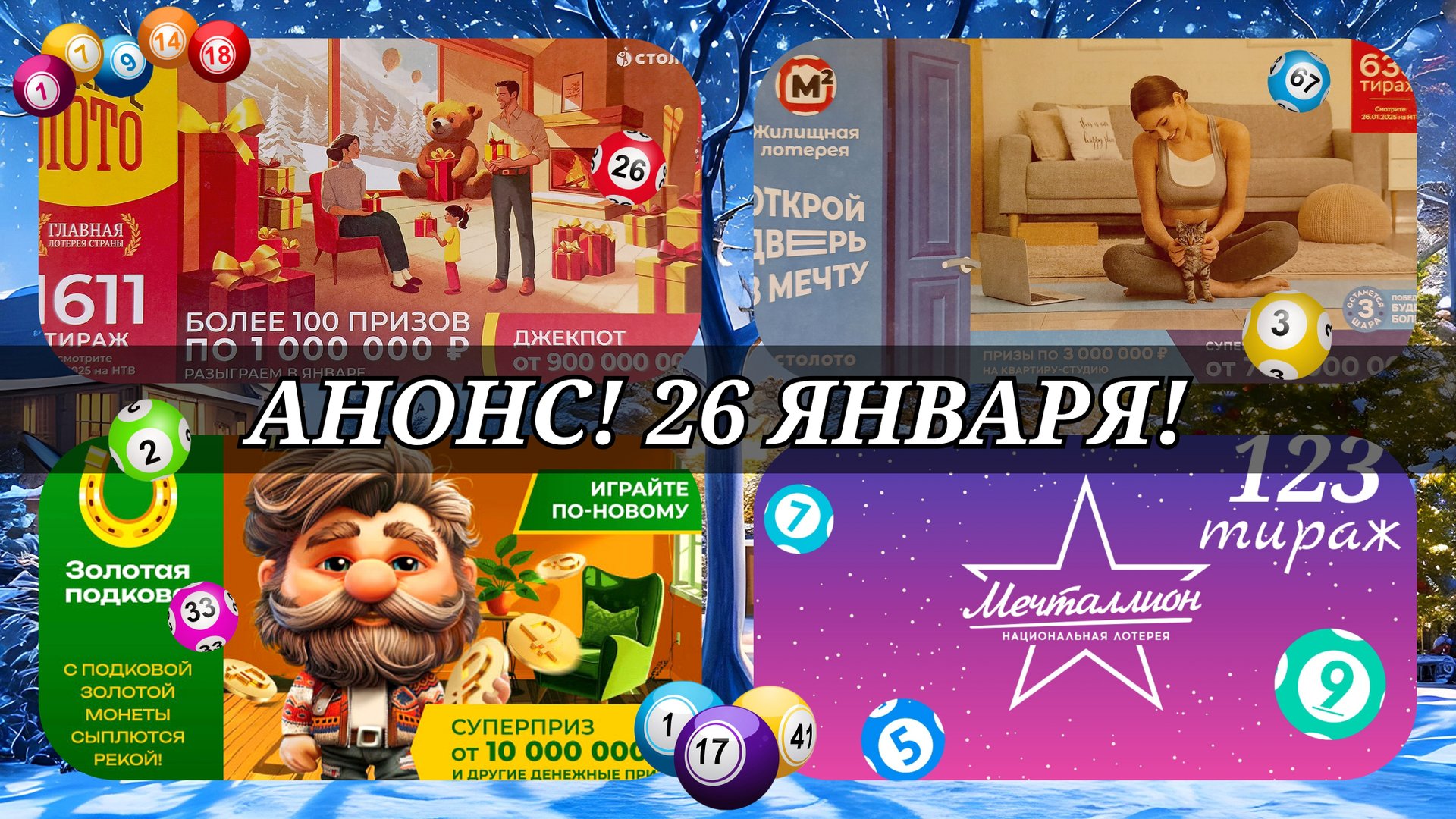 АНОНС на 26 ЯНВАРЯ.РУССКОЕ ЛОТО 1611| ЖИЛИЩНАЯ №635|ЗОЛОТАЯ ПОДКОВА №491| МЕЧТАЛЛИОН №123.