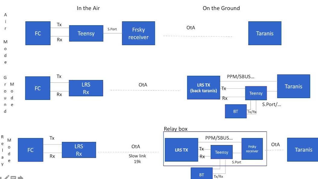 Что такое транслятор протокола MavToPass, и зачем он нужен? MavToPass — это прошивка для трансляции телеметрии Mavlink в телеметрию FrSky Passthru. Телеметрия протокола Passthru — единственная телеметрия, которая работает с превосходным дисплеем LUA от yaapu (Alex Apostoli) скрипты для передатчиков Taranis и Horus. Смотреть yaapus_GitHub Home • yaapu/FrskyTelemetryScript Wiki • GitHub Прошивка MavToPass, работающая в микроконтроллере, преобразует телеметрию Mavlink (1 и 2) в телеметрию Passthru MavToPass можно настроить для работы в одном из трех режимов: Наземный режим (который я выбрал для себя) В наземном режиме транслятор протокола Mav2Passthru обычно размещается вместе с модулем дальнего действия XJT дальнего действия в заднем отсеке Taranis/Horus. Он принимает телеметрию Mavlink от модуля XJT, преобразует ее в телеметрию протокола Passthru и передает ее в S.Port Taranis/Horus. Поскольку приемник FrSky не обеспечивает опрос датчиков, подпрограмма во встроенном ПО эмулирует опрос датчиков приемника FrSky. Воздушный режим В воздушном режиме транслятор протокола Mav2Passthru расположен на борту самолета между полетным контроллером и приемником FrSky. Он преобразует Mavlink из полетного контроллера Pixhawk или APM и передает телеметрию Passththrough на приемник FrSky, который, в свою очередь, отправляет ее на Taranis/Horus на земле. В этой ситуации он реагирует на опрос датчика приемника FrSky. Этот режим необходим для старых полетных контроллеров Arducopter и PX4, которые не могут изначально отправлять телеметрию Passthru. Режим ретрансляции Этот гибридный режим полезен в тех случаях, когда приемопередатчик LRS (trx) (например, DragonLink или Orange) связывается с соответствующим наземным trx, расположенным в «релейном» блоке рядом с использованием телеметрии Mavlink. Подходящее оборудование, которое у меня было: ESP8266 варианты, включая NodeMCU ESP 12F и ESP-F (RFD900/TXMOD) Эти платы поддерживают WiFi, но не Bluetooth, и имеют только один пригодный для использования UART. (При нажатии второй UART доступен с выходом TX только для отладки). Тем не менее, они работают более чем адекватно при использовании SoftwareSerial. (Функция инвертированного S.Port с одним проводом (для режимов AIR и RELAY) является экспериментальной и может работать в будущем). Эта прошивка была успешно прошита на RFD900x/TXMOD. Поддерживается веб-конфигурация и обновление прошивки OTA. SSD1306 0,96-дюймовый OLED-дисплей 128 x 64. Программа Arduino IDE -1.8.19 Ссылка на исходные коды mav2pt : GitHub - zs6buj/mav2pt: Mavlink to FrSky Passthrough protocol telemetry https://github.com/zs6buj/mav2pt Ссылка на форум: Mavlink To FrSky Passthrough Converter - RC Groups https://www.rcgroups.com/forums/showthread.php?3089648-Mavlink-To-FrSky-Passthrough-Converter Использована версия программы: MavToPass_v2.63.7 В дальнейшем надо разбираться с конфигурацией чтобы заработало правильно RSSI.