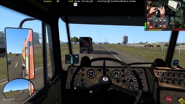 Hey folks, today we haul lumber from Clovi (New Mexico) to Lubbock (Texas). Recorded from a drivers perspective without comentary. Enjoy the ride. --- Hallo Leute, heute transportieren wir Bauholz von Clovis (New Mexico) nach Lubbock (Texas). Aufgenommen aus der Fahrerperspektive und ohne Kommentar. Viel Spaß. --- Inspiration for the 2-Shifter Setup by flyboy463 https://forum.scssoft.com/viewtopic.php?f=178&t=288627 Inspiration for the Range&Splitter Setup by flyboy463 https://forum.scssoft.com/viewtopic.php?f=178&t=300810 === Timestamps === 00:00:00 Intro 00:00:30 Loading and Departure 00:02:10 Clovis (NM) 00:07:00 On the Road 00:22:40 Lubbock (TX) 00:24:50 Arrival and Parking 00:29:26 Summary and Outro === Truck === Kenworth K100E VIT 6x4 by Overfloater https://steamcommunity.com/sharedfiles/filedetails/?id=1815959194 Engine: Cummins N14 | 525 hp | 1850 lb-ft (2508 Nm) Sound: Engine sound mega pack by Kriechbaum https://forum.scssoft.com/viewtopic.php?t=201930 Transmission: Eaton RTLO-22918B (18 speed manual) | Rear Axle 3.55 === Software === American Truck Simulator, Version 1.46 https://www.scssoft.com/projects/american-truck-simulator Navigation voice: Real US Google Nav for ATS v1.37.x by 436841414 (madtrucker89) https://steamcommunity.com/sharedfiles/filedetails/?id=2012820799 Antialiasing fix using NVIDIA Profile Inspector https://roextended.ro/forum/viewtopic.php?t=1000 Recorded with OBS Studio, no editing, no cutting https://obsproject.com/ Button mapping and macros: Joystick Gremlin + vJoy device https://whitemagic.github.io/JoystickGremlin/ Animated camera overlay made with SimHub https://www.simhubdash.com/ === Hardware === Steering Wheel + Shifter 1: Logitech G27 Shifter 2: SHH NEWT2 https://www.shiftershh.com/ SKRS-Shift Knob made by ALMAR https://pphalmar.pl/gry-symulacyjne Wheel cam: GoPro Hero 2 Button board: Saitek PCDash2 (very old hardware) Head tracking device: Track IR 4 DIY button box on the steering wheel === PC Specs === CPU: Intel I7-6700K @4.2 Ghz GPU: NVIDIA GeForce RTX 2060 Super MEM: 16 GB DDR4 Display: Philips 342B1C @2560x1080 === Tags === American Truck Simulator, ATS, Virtual Trucking, Silent Trucking, ASMR, Virtuell LKW Fahren, Manual Shifting, Manuelles Schalten, Floating Gears, Schalten ohne Kupplung, Trailer Reverse Parking, Auflieger Rückwärts Parken