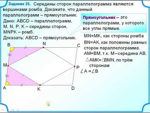 Середины сторон параллелограмма являются вершинами ромба. Докажите, что данный параллелограмм – прямоугольник.