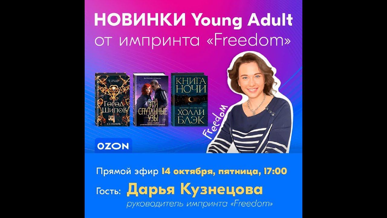 Приглашенный гость: Дарья Кузнецова, руководитель импринта «Freedom». В программе эфира: • Главный хит осени: новинка от автора бестселлера «Жестокий принц», королевы фэнтези, Холли Блэк - «Книга ночи»; • Новинка Эммы Скотт, автора сентиментальной прозы: «Частица твоего сердца (#3)», завершающая цикл «Потерянные души»; • Новинки темного взрослого фэнтези: «Город шипов» и «Блик»; • Ответы на ваши вопросы о книгах импринта; • Скидки на избранные книги во время эфира; • Розыгрыш книг. Вопросы, на которые вы получите ответы: • Какие тренды развиваются сейчас в фэнтези Young Adult? • Какие популярные книги точно стоит прочитать? • Какие зарубежные авторы, пишущие для молодежи, пользуются популярностью?