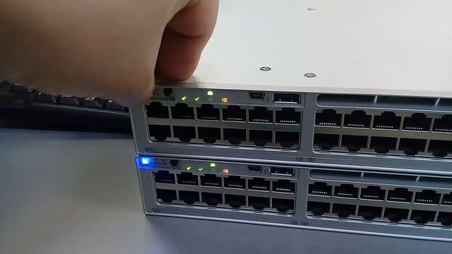 Определить порядок коммутаторов в стеке можно кнопкой на передней панели. Один из режимов включает мигание светодиода, согласно порядку в стеке. У первого мигает первый светодиод, у второго — второй и так далее. Можно объединить до восьми коммутаторов Cisco Catalyst 9300-48T в стек.