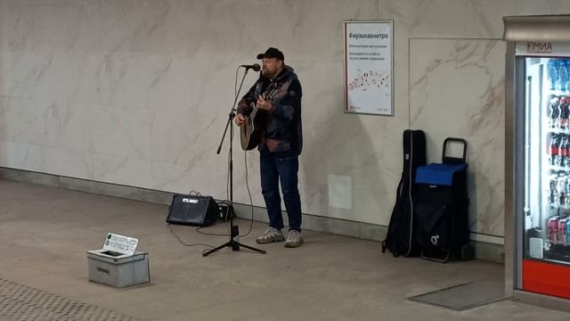 Вечный хит московской подземки «Музыкант» (1971 г.) Константина Никольского. Это то, за что стоит любить музыку улиц. Судя по расписанию вступлений на сайте «Музыка в метро», гитариста зовут Андрей Морев (vk.com/id290547212). Впрочем, твёрдой уверенности у меня нет. Место действия — подземный переход у станции метро Сухаревская Время действия — 11 апреля 2023 года, около 20:30.