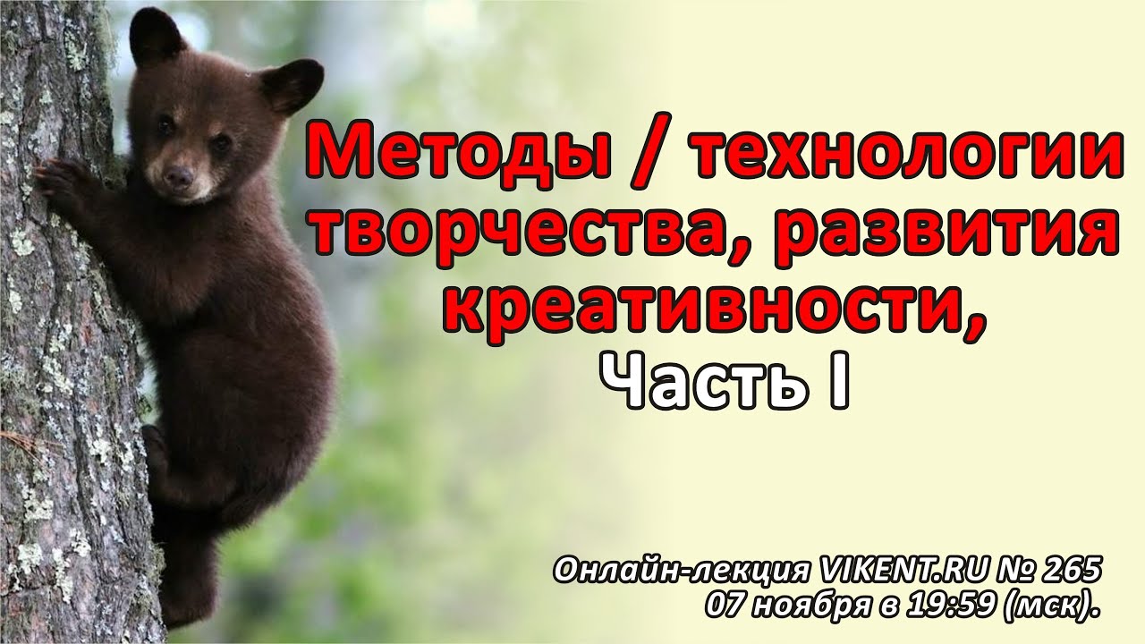#Изобретательство #Креативность #Стратегии #Методики МЕТОДЫ / ТЕХНОЛОГИИ ТВОРЧЕСТВА & РАЗВИТИЯ КРЕАТИВНОСТИ Часть I https://www.youtube.com/watch?v=-DlLwehp6MM – бесплатный онлайн творческий вечер Игоря Леонардовича Викентьева № 265 от 07 ноября 2021 года в 19:59 по московскому времени. Однократная онлайн-регистрация Новичков в творческий проект о методах и методиках творчества / креатива: https://vikent.ru/w0/ +++++ Полезные прямые ссылки на тему о развитии креативности: 1) Приличные люди по версии VIKENT.RU: https://vikent.ru/w1/ 2) Карта творческого портала VIKENT.RU: https://vikent.ru/map/ 3) СО-ФИНАНСИРОВАНИЕ ПРОЕКТА: HTTPS://VIKENT.RU/W5/ 4) Проект VIKENT.RU в соц-сетях: https://vikent.ru/w9/ 5) Бесплатные онлайн-лекции по воскресеньям в 19:59 (мск) для всех желающих: https://vikent.ru/w0/ При выполнении еженедельных креативных заданий – обучение методикам творчества от продвинутых студентов до профессоров из разных стран – принципиально бесплатно. +++++ ОГЛАВЛЕНИЕ-265 (начало темы): «О творчестве написано много, в том числе и ерунды». Авиаконструктор О.К. Антонов. 00:00 Рекомендации Новичкам; 8:16 1) Ключевой признак Творчества – Новизна: https://vikent.ru/230/5/ 24:43 2) Вынужденная новизна слов в стихах; 33:23 3) Крупнейший эксперимент по решению изобретательских задач; 39:37 4) Подражание чужому – самая массовая стратегия творчества; 40:54 5) Стратегия подражания у обезьян и у человека задана психофизиологически; 43:52 6) Эффект быстрого (!) обучения у обезьян; 47:31 7) Подражания и необходимость (!) кризисов по Арнольду Тойнби; 48:38 8) Пучок современных стратегий подражания; 51:41 9) Верно ли: кто старше – тот умнее?.. 56:46 11) Современные (!) риски групповых обсуждений; 1:00:48 12) Примерные количественные оценки возможностей «естественного креатива» прямо из «головы»; 1:03:30 13) Несовершенство русской культуры, которого точно НЕТ в краеведческих музеях... 1:05:28 14) Эффекты инерции мышления и поведения (включая методологов); 1:11:57 15) Несменяемый «почерк преступника»; 1:12:26 16) Да: и учёные подвержены эффектам инерции мышления... 1:13:51 17) Простой способ борьбы с инерцией мышления в искусстве по Б. Брехту; 1:16:15 18) Случайность и инверсия, как сбивки инерции мышления… 1:21:51 19) Проявление закономерностей разного уровня по В.М. Глушкову; 1:27:54 20) 1864 год: Закон регресса психики на предыдущий уровень по английскому неврологу Джона Джексона; 1:27:40 21) Мелкие возможности и крупные идиотизмы изменённых состояний сознания (ИСС); 1:34:59 22) Зрелость: переход от «хапков» к МНОГОходовкам; + Новые исследовательские темы – 8. +++++ Сообщества творческого онлайн-курса VIKENT.RU по творчеству / креативу; новым методическим разработкам, а также с ответами на вопросы типа: как создать творческий проект? ВКОНТАКТЕ: 19.59 Online-лекции VIКЕNT.RU о креативе и гениальности: https://vk.com/online_vikent ФЕЙСБУК: Творческие встречи и конференции проекта VIKENT.RU: https://www.facebook.com/groups/vikent.open +++++ Однократная и свободная онлайн-регистрация Новичков + возможность задать Ваши вопросы на ближайший консультационный день: https://vikent.ru/w0/ +++++ + Ваша подписка на лучший интеллектуальный видеоканал на русском языке VIKENT.RU – уже более 17 100 Подписчиков: https://www.youtube.com/c/VikentRu_video?sub_confirmation=1 +++++ ВАЖНО: в чате-265 и на интеллектуальном видеоканале VIKENT.RU по нашим Правилам следует оставлять Ваши новые вопросы / комментарии, начиная свой пост только так: 1) Либо: Имя Отчество Фамилия полностью; 2) Либо с использованием скобок: NICKNAME (Имя Отчество Фамилия полностью). Правила интеллектуального видеокан