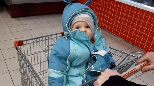Первый раз в супермаркете. Катаемся в тележке))) Самые первые впечатления!