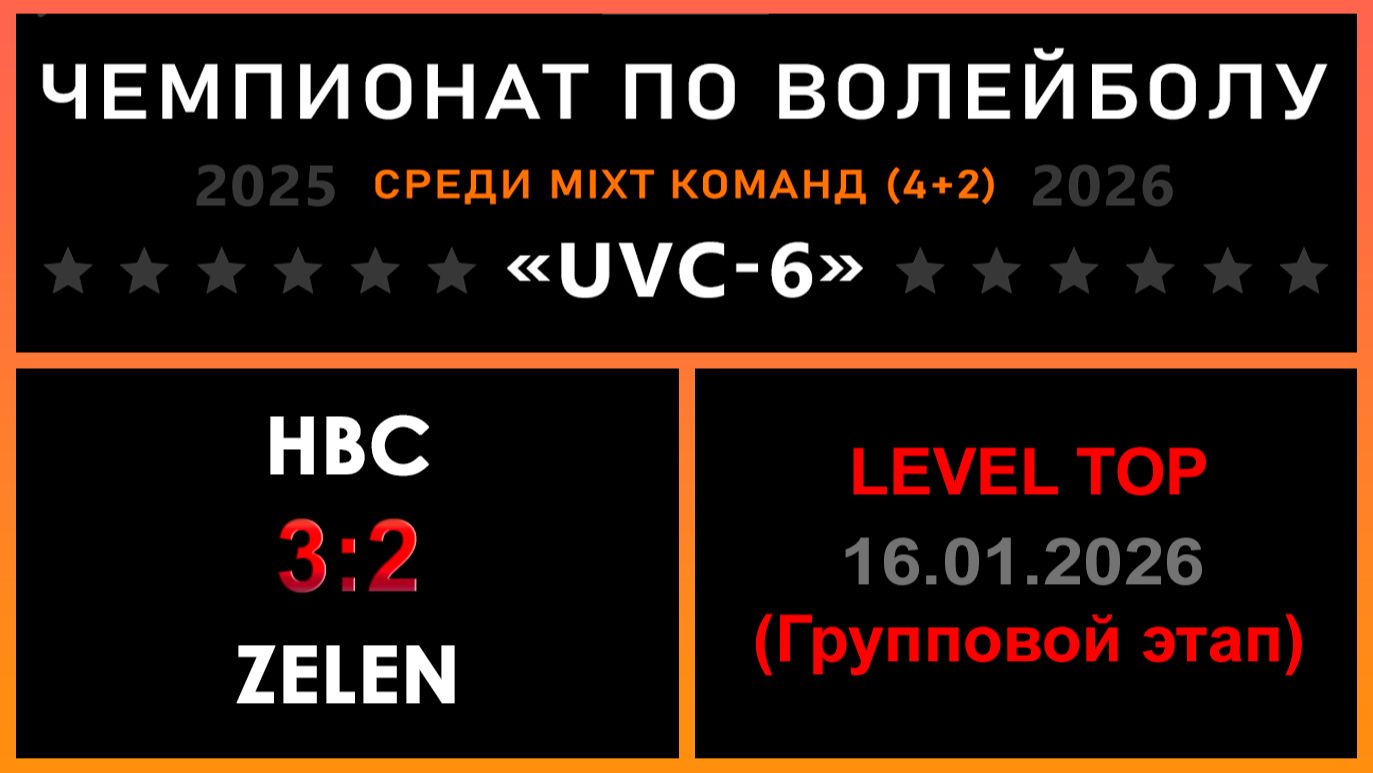 UVC-6 (Mixt): Чемпионат UVC Лиги по волейболу среди MIXT команд (4+2), 2025-2026 гг. Результаты игры: LEVEL TOP (Групповой этап) 16.01.2026 НВС - ZeleN 3:2 (25:18, 13:25, 26:28, 25:20, 15:10) Холодно на улице - жарко в зале! Отличная битва, сегодня НВС были сильнее! «РЕШАЛЫ» - конкурс для команд : ✅ НВС идут дальше! «Nostradamus trophy» - конкурс для участников группы ВКонтакте: ✅ 6 - количество участников, которые смогли предсказать точный исход матча! #UVC_ЛИГА_ЧЕМПИОНАТ_UVC_6_Mixt