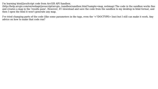 GIS: ArcGIS JavaScript API Sandbox doesn't properly save html files (they doesn't work) Helpful? Please support me on Patreon: https://www.patreon.com/roelvandepaar With thanks & praise to God, and with thanks to the many people who have made this project possible! | Content (except music & images) licensed under CC BY-SA https://meta.stackexchange.com/help/licensing | Music: https://www.bensound.com/licensing | Images: https://stocksnap.io/license & others | With thanks to user kenbuja (gis.stackexchange.com/users/3076), user Delonix R. (gis.stackexchange.com/users/61244), and the Stack Exchange Network (gis.stackexchange.com/questions/251400). Trademarks are property of their respective owners. Disclaimer: All information is provided "AS IS" without warranty of any kind. You are responsible for your own actions. Please contact me if anything is amiss at Roel D.OT VandePaar A.T gmail.com