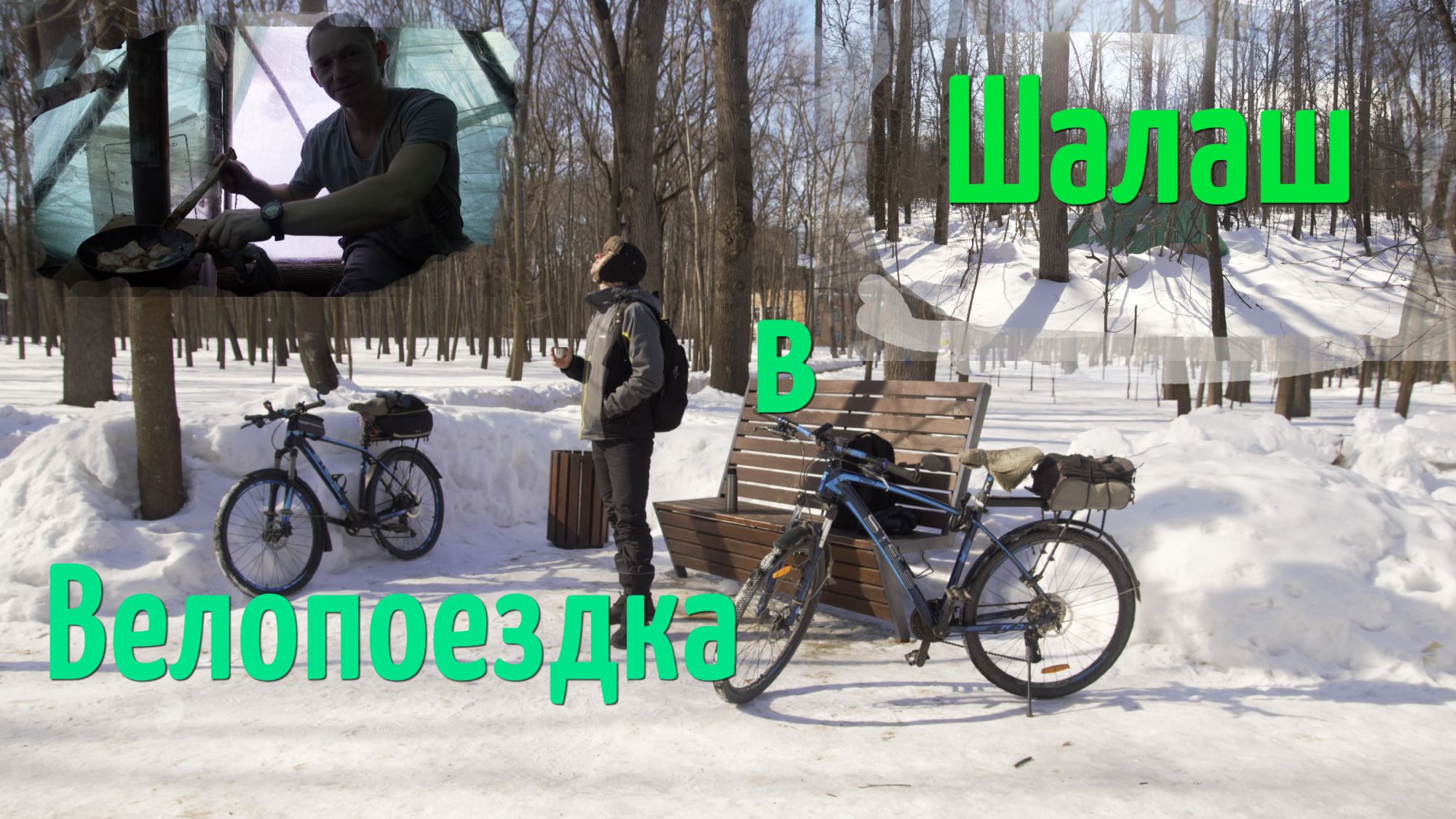 В шалаш на велосипеде по снегу вдвоем. Жарим мясо в сковороде на печке.