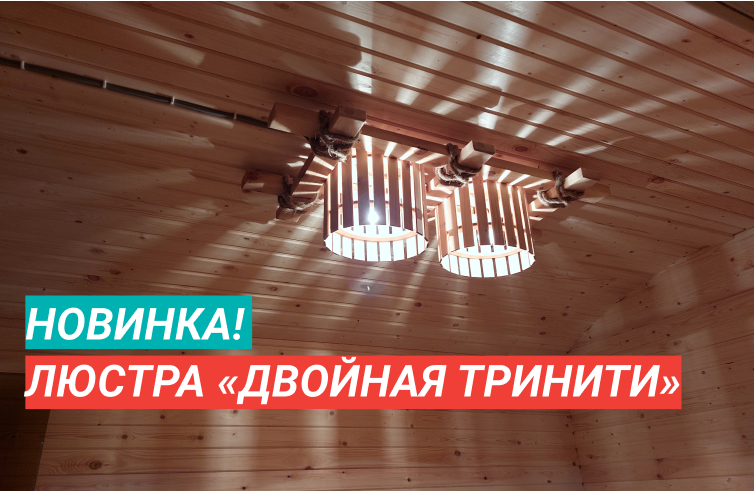 Двойная люстра «Тринити» изготовлена специально для перевозных бань Дмитрия Глушакова. Состоит из двух деревянных плафонов из реечек и прямоугольного каркаса, декорированного канатом. Не входит в базовую комплектацию. Такую люстру можно заказать отдельно при составлении договора на покупку бани.