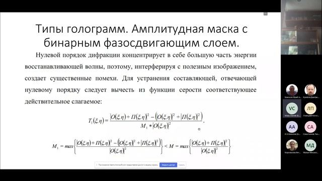 https://events.rudn.ru/event/192/ Efficient methods of synthesis of holograms with a combined structure and mathematical modeling of holographic images Vitaly V. Chernik Engineer of the Laboratory of Control of Mechanical Systems, Ishlinsky Institute for Problems in Mechanics RAS, Moscow. The efficient methods for the synthesis of holographic masks, modeling of the holographic images exposure and images quality optimization have been developed based on the Fresnel-Kirchhoff approach. The methods are implemented as a software package in C++ for cluster systems. Numerical experiments for a classification of errors arising in the process of holographic lithography were conducted and a table of error tolerances are obtained. Methods of modeling holographic images under conditions of limited spatial coherence and coherence time are proposed. The layered design and corresponding corrections in the method of synthesis of holographic masks are proposed, as well as the method for calculating diffraction on a periodic layered structure based on Galerkin approach. The corresponding software module has been developed, the calculation results have been verified by analytical solutions on the limited class of structures and calculations by the approximate method. Эффективные методы синтеза голограмм с комбинированной структурой и математического моделирования голографических изображений Черник Виталий Валерьевич Инженер лаборатории механики управляемых систем Института проблем механики, г. Москва. На основе подхода Френеля-Кирхгофа разработаны методы синтеза голограммных масок, моделирования получения голографических изображений и их оптимизации. Методы реализованы в виде программного комплекса на языке С++ для кластерных систем, с помощью которого получена классификация погрешностей, возникающих в процессе голографической литографии и таблица допусков на погрешности. Предложены методы моделирования голографических изображений в условиях ограниченной временной и пространственной когерентности источника. Предложена слоистая архитектура и соответствующие коррекции в методе синтеза голограммных масок, а также метод расчёта дифракции на периодической слоистой структуре на основе метода Галёркина. Разработан соответствующий программный модуль, результаты расчетов проверены аналитическими решениями и расчетами приближенным методом на ограниченном классе структур.