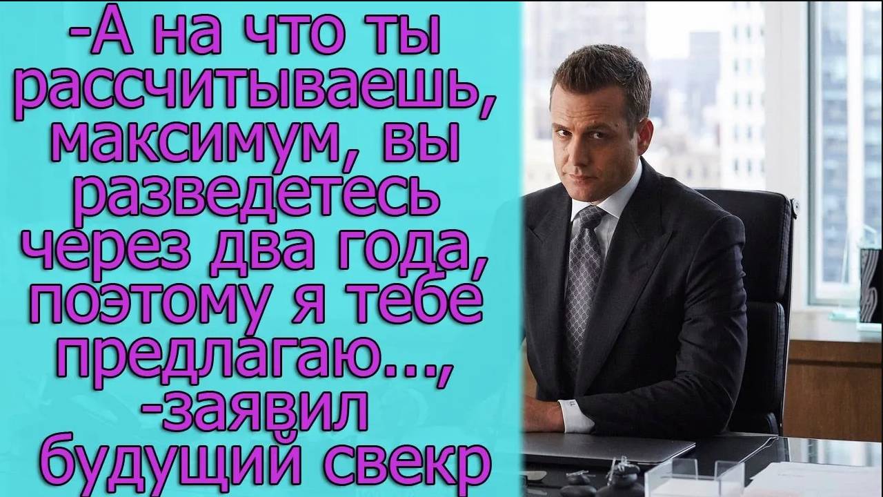 - А на что ты рассчитываешь, максимум, вы разведетесь через два года, поэтому я тебе предлагаю...