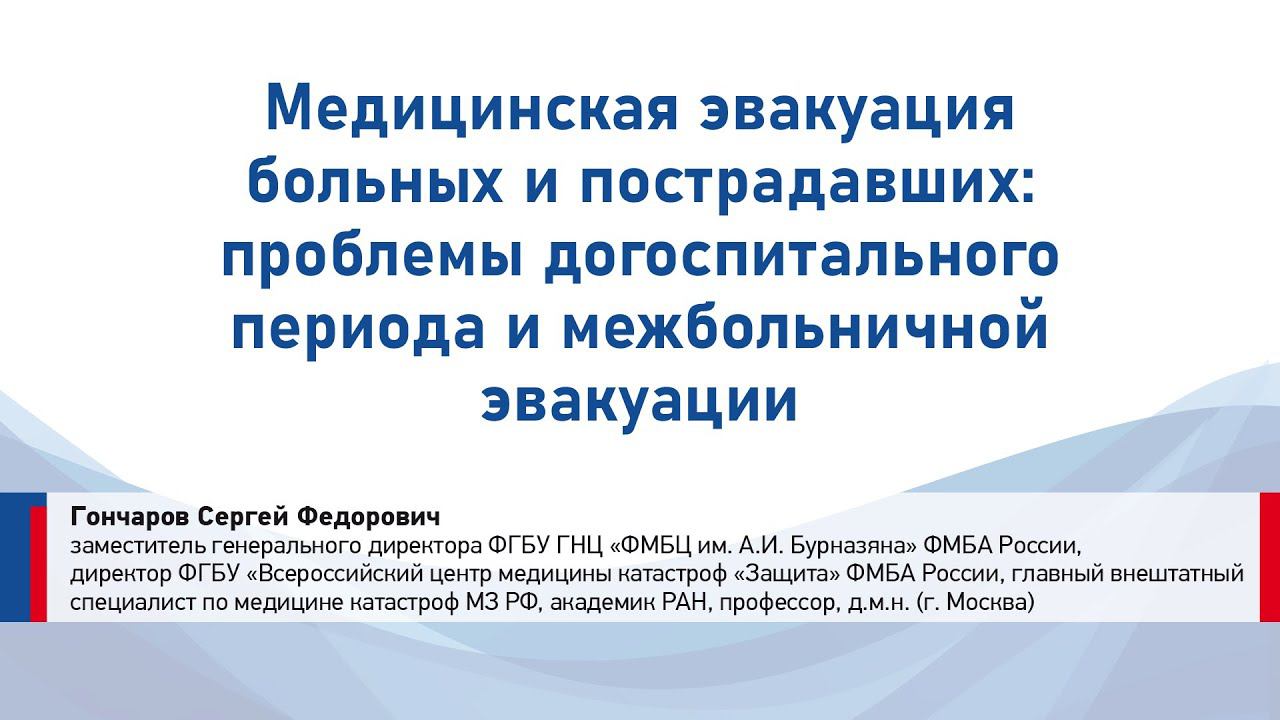 Межрегиональная научно-практическая конференция с международным участием «Актуальные вопросы организации оказания скорой, в том числе скорой, специализированной медицинской помощи» Медицинская эвакуация больных и пострадавших: проблемы догоспитального периода и межбольничной эвакуации Гончаров Сергей Федорович заместитель генерального директора – директор ФГБУ «Всероссийский центр медицины катастроф «Защита» ФГБУ ГНЦ «ФМБЦ им. А.И. Бурназяна» ФМБА России, главный внештатный специалист по медицине катастроф Минздрава России, д.м.н., профессор, академик РАН