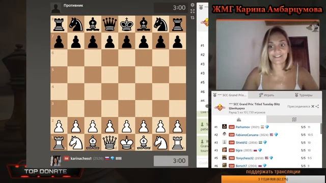 Титулованный вторник на chess.com 10 туров 3+1 Поддержать канал: https://www.donationalerts.com/r/karinachess1 Подписаться на мой канал: https://www.youtube.com/channel/UChor8u_hhgrjX2lt0QLzZHA?sub_confirmation=1 Стать спонсором канала: https://www.youtube.com/channel/UChor8u_hhgrjX2lt0QLzZHA/join Рестрим: https://www.twitch.tv/karinachess1 Рада приветствовать Вас на канале женского международного гроссмейстера, международного мастера Карины Амбарцумовой! Я - профессиональная шахматистка и тренер. Здесь вы сможете найти обучающие видеоуроки по шахматам, комментарии турниров, стримы моей игры в блиц шахматы. Подписывайтесь на мои странички в соц.сетях: ВКонтакте: https://vk.com/karinachessclub Twitch: https://www.twitch.tv/karinachess1 Почта для связи: karinachess@mail.ru Поддержать канал: https://www.donationalerts.com/r/karinachess1 Мой сайт: http://chesscoach.ru/