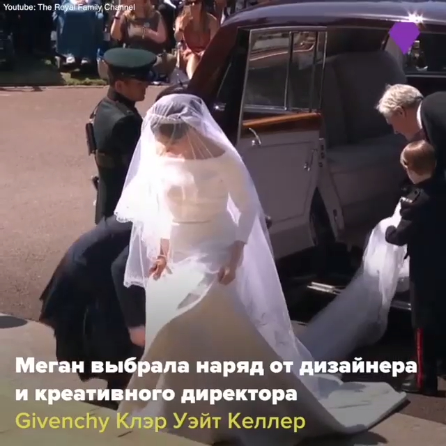 Имя дизайнера свадебного наряда держалось в строжайшем секрете. В итоге, выбор Меган пал на британского дизайнера Клер Уэйт Келлер. В прошлом году она стала креативным директором французского модного Дома Givenchy. При разработке дизайна платья Келлер ориентировалась на пожелания Меган создать элегантный и вместе с тем чувственный образ. Так, Меган появилась на церемонии в белоснежном изысканном платье, созданным из эксклюзивного двойного шелка-кади. Модель с рукавами три четверти и с длинным шлейфом подчеркнула точеную фигуру Маркл. Основной акцент в дизайне был сделан на фигурный вырез, который открывает плечи невесты. Также образ Меган дополняла пятиметровая фата, украшенная вышитым вручную цветочным орнаментом (он состоит из изображений цветов, которые растут в 53 странах Содружества Великобритании). Завершала look невесты великолепная тиара королевы Марии с бриллиантами и сапфирами. #свадьба #свадьбапринца #принцгарри #меганмаркл