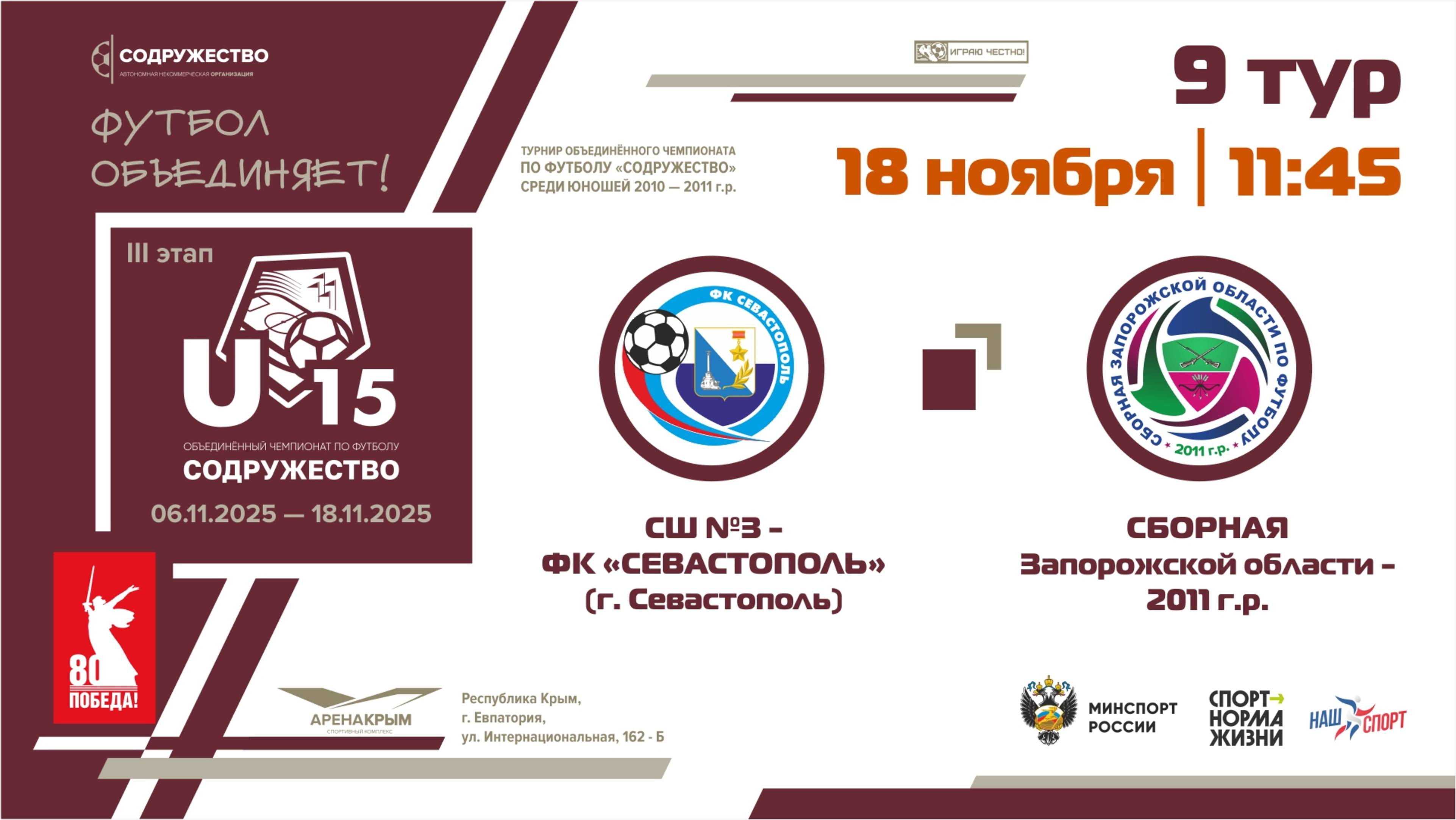 9 ТУР | U-15 | СШ №3-ФК "Севастополь" - Сборная Запорожской области 2011 г.р. | 18.11.2025