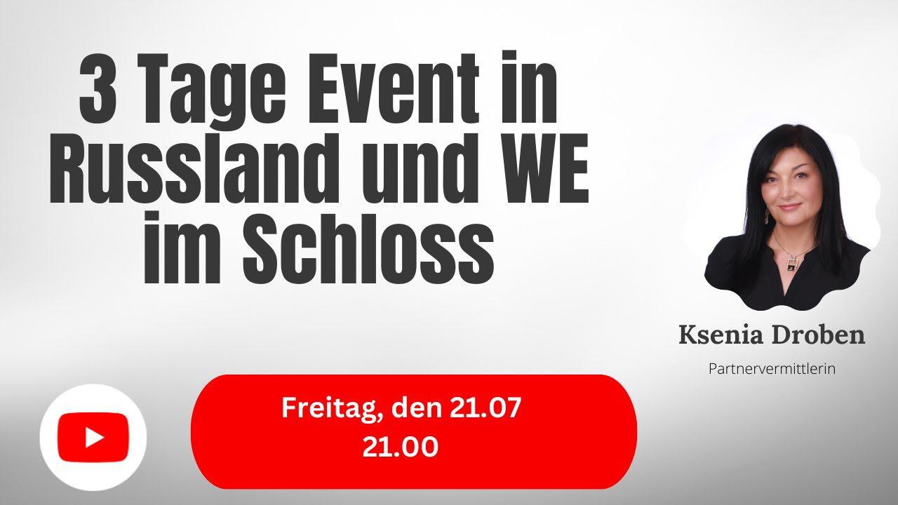 Sie haben mich wahrscheinlich verloren – so lange Zeit ohne Webinare. Aber ich habe meine Gründe: sofort nach der Single Party in München bin ich nach Kazakhstan (Astana) geflogen, um an den Dreharbeiten für österreichisches Fernsehen teilzunehmen. Im Rahmen dieser Reportage habe ich 3 österreichische Herren betreuen müssen, für die ich sowohl Einzeldates als auch verschiedene mini-Single-Events organisiert habe. Jetzt sind die Dreharbeiten vorbei und ich kehre zu meiner Routine zurück. Das wöchentliche Webinar findet diesmal am Freitag, den 21.07 um 21.00 statt Die Themen: ich erzähle Ihnen über Münchener Single Dating Party, präsentiere und beantworte Ihre Fragen zu 3-Date Single Event in Sankt Petersburg in August und zum Wochenende in Schloss in November Wir treffen uns am Freitag, den 21.07 um 21.00 Treffpunkt: YouTube Channel "Ksenia Droben : https://www.youtube.com/@KseniaDrobenPartnervermittlung Alternativ auch Facebook: https://www.facebook.com/ksenia.droben/ Twitch: https://www.twitch.tv/kseniadating LinkedIn: https://www.linkedin.com/in/ksenia-droben-911289148/ Tiktok: @kseniamatchmaking Ich freue mich auf Sie und Ihre Fragen Mit freundlichem Gruß/ Best wishes Ksenia Droben CEO, International Matchmaker Ksenia Droben Partnervermittlung www.droben-partnervermittlung.de Tel. +49 6221 1868800 Whatsapp +4915203663653 https://www.facebook.com/ksenia.droben