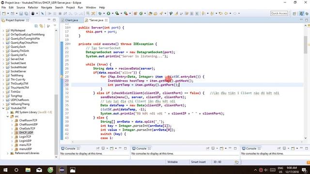 Bài tập Lập trình mạng. Mô phòng dịch vụ cấp phát IP trong DHCP giữa nhiều Client với 1 Server. Nếu quá 10s Client nào không còn kết nối Server sẽ thu hồi DHCP đã cấp phát. Giao thức UDP Nếu bạn quan tâm source code bạn có thể comment bên dưới or liên hệ trực tiếp với tôi. Facebook: https://www.facebook.com/minhhuyptit