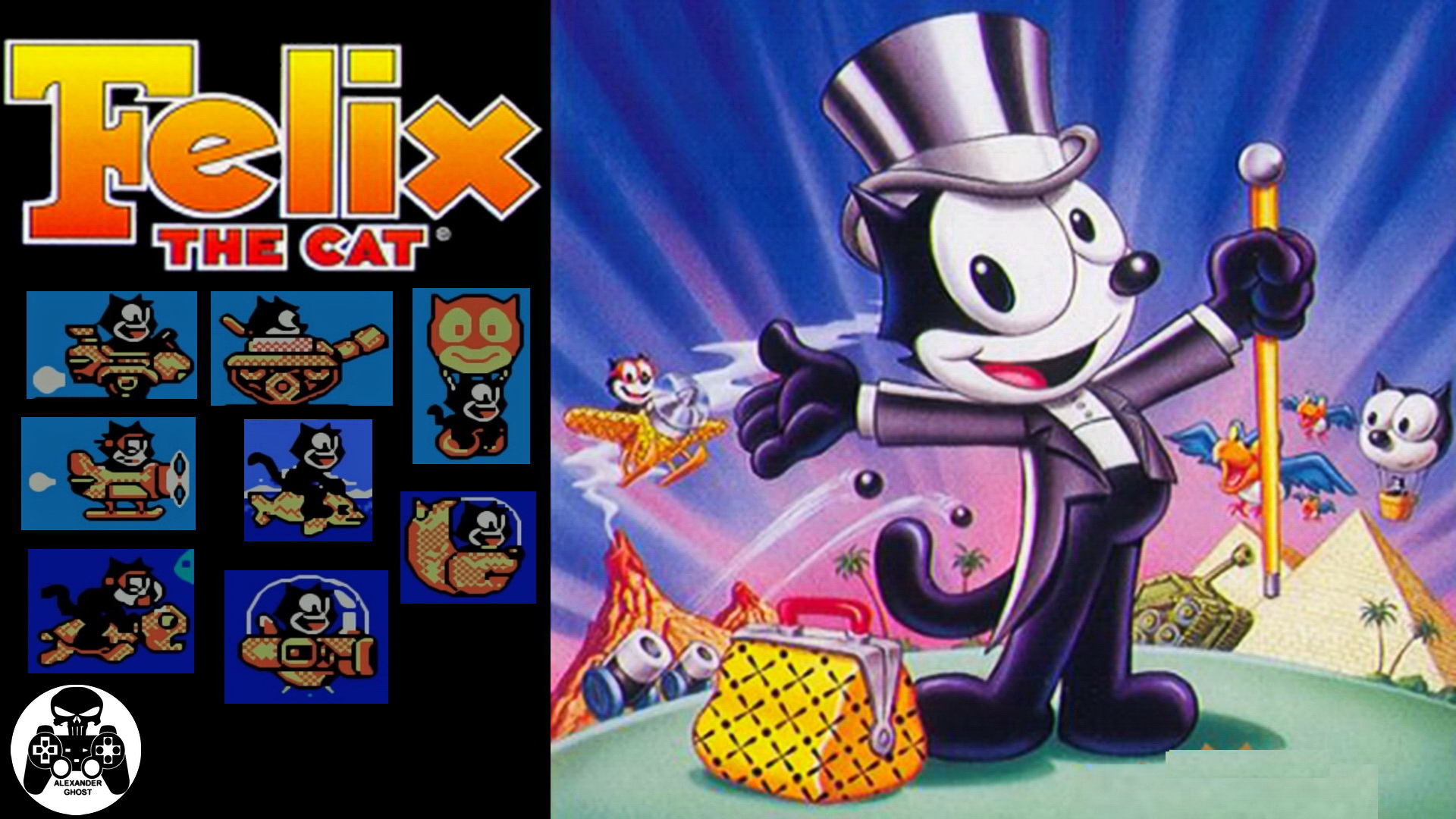 Кот Феликс денди прохождение. Dendy/NES/Famicom. Full walkthrough longplay 1080p60fps. Сюжет: Злой профессор хочет заполучить волшебную сумку, принадлежащую Феликсу, для этого он похищает его возлюбленную Китти. Игрок, управляя Котом Феликсом, должен добраться до убежища профессора и спасти свою возлюбленную. Миры: Один из первых уровней игры и игровой интерфейс Всего в игре девять миров, как правило, с тремя уровнями каждый. В конце каждого мира (кроме одного) игроку предстоит встреча с боссом. Первый мир полностью сухопутный. За победу над боссом даётся 10 000 очков. Во втором мире первый уровень проходит в воздухе, оставшиеся два — на суше. За победу над боссом даётся 20 000 очков. Третий мир состоит из двух сухопутных уровней в начале и из третьего — в воздухе. За победу над боссом даётся 30 000 очков. Четвёртый мир сначала преодолевается по суше, затем на воде, и в заключение, — под водой. За босса игрок получает 40 000 очков. Пятый мир вначале преодолевается по суше, затем по воздуху, и затем снова по суше. За победу над боссом даётся 50 000 очков. Шестой мир включает в себя надводное и подводное путешествие, без третьего уровня. За босса игрок получает 60 000 очков. Седьмой мир полностью сухопутный, а за босса игрок получает 70 000 очков. Восьмой мир состоит из одного уровня — космического, и не содержит босса. Девятый, заключительный мир, полностью сухопутный. За победу над боссом даётся 90 000 очков. Иногда между мирами происходит телефонная беседа между Феликсом и злым профессором.