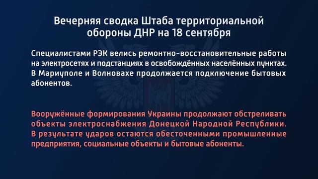 Вечерняя сводка Штаба территориальной обороны ДНР на 18.09.2022