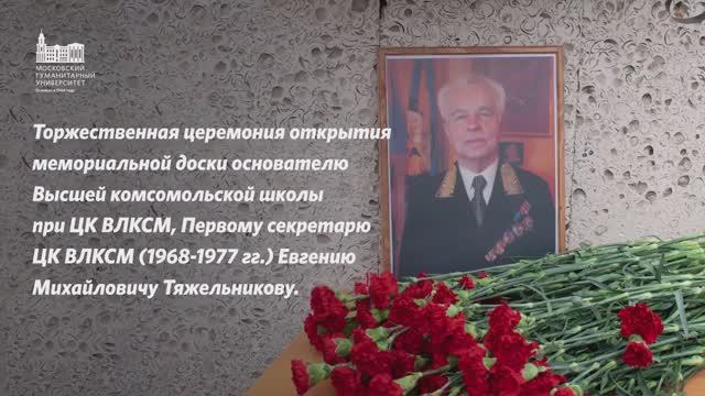 29 октября с. г., в 103-ю годовщину ВЛКСМ, на здании 3-го учебного корпуса Московского гуманитарного университета БЫЛА установлена Мемориальная Доска «Основателю Высшей комсомольской школы при ЦК ВЛКСМ, Первому секретарю ЦК ВЛКСМ (1968-1977гг.) Евгению Михайловичу Тяжельникову». В торжественном событии участвовали ректор университета И.М.Ильинский, проректоры, деканы, заведующие кафедрами, преподаватели, сотрудники, представители студенчества. Состоялась также презентация книги «Очерки» ректора МосГУ И.М.Ильинского, в которой рассказывается о выдающихся воспитанниках и руководителях комсомола – Б.Н.Пастухове, Л.И.Швецовой, Н.В.Трущенко, В.Б.Ломейко, Ю.Д.Поройкове и других.