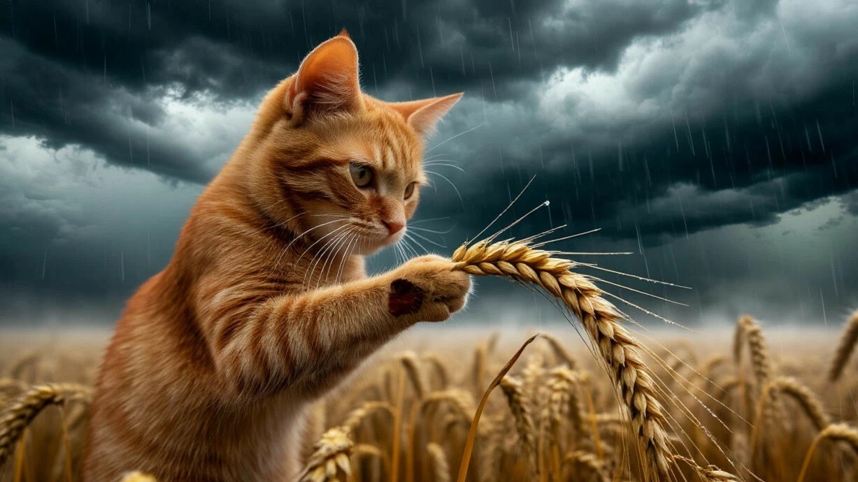 Классное видео о рыжем коте-284 выпуск: Одиночество в ненастье: кот и природа в объятиях грозы. Рыжий кот, окруженный игривыми мягкими колосьями золотистой пшеницы, полностью поглощен своим восторгом и не обращает внимания на надвигающуюся грозу.