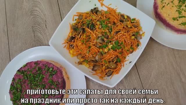Готовлю сразу три праздничных салата, которые идеально подойдут к новогоднему столу. Все рецепты простые, но смотрятся так, будто вы готовились целый день. Ингредиенты салата №1: 500 граммов моркови. 2 ст.л. сахара. 0,5 ч.л. соли. 1 ч.л. кориандра. 3 ст.л. уксуса 9 %. 5 зуб. чеснока. 20 мл. горячего растительного масла. 500 граммов грибов ( у меня шампиньоны, вы можете взять любые по вашему вкусу). 30 мл. соевого соуса. 200 граммов консервированной кукурузы. свежая зелень петрушки и семена кунжута. Ингредиенты салата №2: 30 граммов изюма. 40 граммов чернослива. 2 вареных моркови. 180 граммов твердого сыра. 5 зуб. чеснока. 2 вареных свеклы. 2 ст.л. грецких орехов. 9 ст.л. майонеза. свежая зелень петрушки по желанию. Ингредиенты салата №3: 3 вареных картофеля. 1 небольшая луковица. 30 мл. уксуса (9%). 30 мл. воды. 250 граммов слабосоленой селедки. 2 вареных свеклы. 2 вареных моркови. 150 граммов копченого сыра. 9 ст.л. майонеза. свежая зелень петрушки. #рецептсалата #салатсрыбой #праздничныйсалат #вкусныерецепты Подписывайся на канал и делись видео с друзьями. Также у меня на канале еще очень много вкусных рецептов, и еще больше рецептов ждет вас впереди. Телеграмм https://t.me/vkusnierecipe Вконтакте - https://vk.com/vkusnierecipe Одноклассники - https://ok.ru/group/70000000861442 Дзен - https://clck.ru/3GMSjT Весь музыкальный контент, использующийся в видео на данном канале размещён на основании лицензии Creative Commons 4.0 вариант лицензии CC0 (https://creativecommons.org/licenses/by/4.0/) с медиатеки, где не требуется указания авторства.