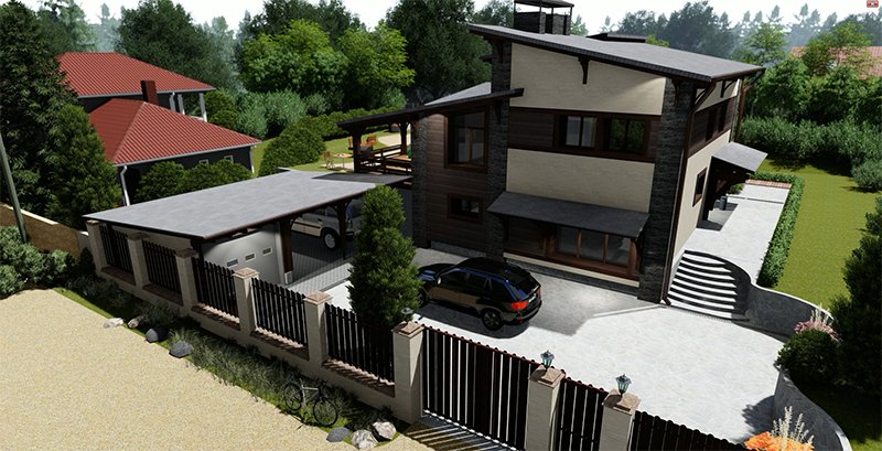 В данном случае, применен комбинированный вентилируемый фасад с утеплением. Используемые материалы при отделке: японский сайдинг, искусственный камень, натуральное дерево