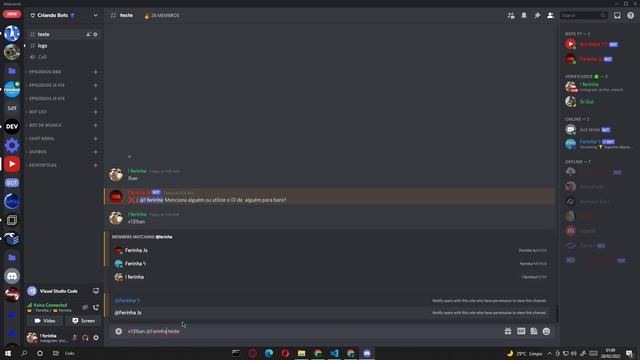 ? Ative o sininho de notificações para receber meus vídeos ? ? | Códigos dos comandos do vídeo: https://discord.gg/bMq8GC7dJV ? | Meu bot (Ferinha ϟ): https://discord.com/oauth2/authorize?client_id=782362123199709224&permissions=1103740005623&scope=applications.commands%20bot ? | Meu bot (Talker Bot): https://discord.com/oauth2/authorize?client_id=809789679615475722&permissions=8&scope=applications.commands%20bot ? | Vs code: https://code.visualstudio.com/ ? | Node.js: https://nodejs.org/en/ 1️⃣ | Discord bot developer PORTAL: https://discord.com/developers/applications 2️⃣ | Discord bot calculator: https://discordapi.com/permissions.html ? | Twitch: https://www.twitch.tv/Oferinha ? | Instagram: https://www.instagram.com/vitor_menoli/ ? | Discord: https://discord.gg/bMq8GC7dJV