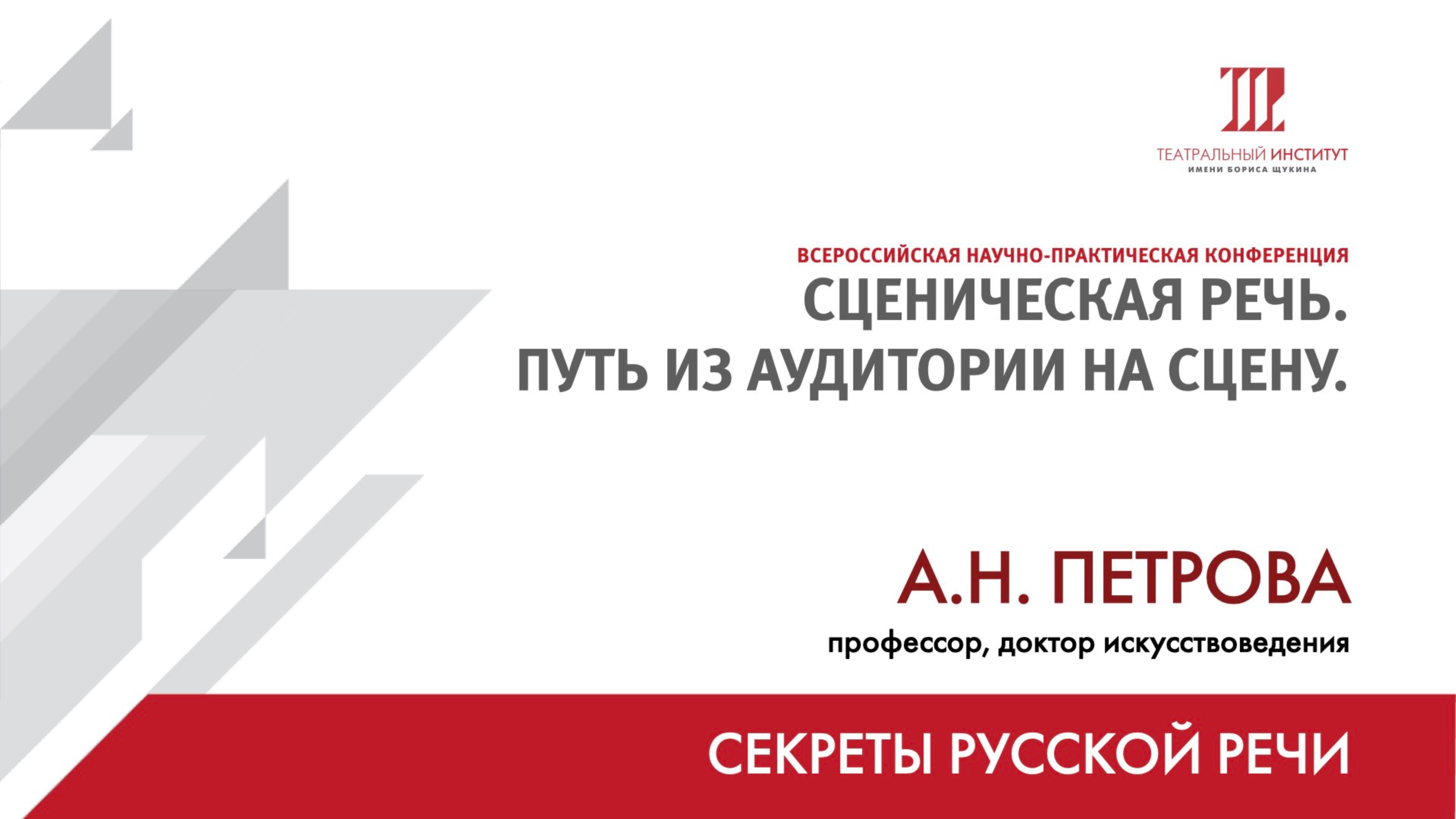 Общероссийская научно-практическая конференция «Сценическая речь: путь из аудитории на сцену» Организаторы: Кафедра сценической речи ГИТИС, Кафедра сценической речи Театрального института имени Бориса Щукина 21 ноября 2024 г. Тема дня: «Живое слово и театральная педагогика» Техника речи. Из опыта 2023-2024 учебного года. Модератор – Анна Марковна Бруссер Сообщение «Секреты русской речи» – А.Н. Петрова, профессор, доктор искусствоведения. Театральный институт им. Бориса Щукина при Государственном академическом театре им. Евгения Вахтангова. Основное здание Театрального института. 119002, Россия, г. Москва, Большой Николопесковский пер., д. 12 А, стр.1. Фото Елены Бекиш. Видео Вячеслав Новиков. Архив Учебного театра. © Театральный институт имени Бориса Щукина. 2024 г. * Данное мероприятие реализовано в рамках Программы стратегического академического лидерства «Приоритет 2030». Театральный институт имени Бориса Щукина включен в программу "Приоритет 2030" в 2021 году. В 2023 году институт принял участие в проекте «Цифровые кафедры», разработав образовательную программу «SMM-технологии в театральной сфере».