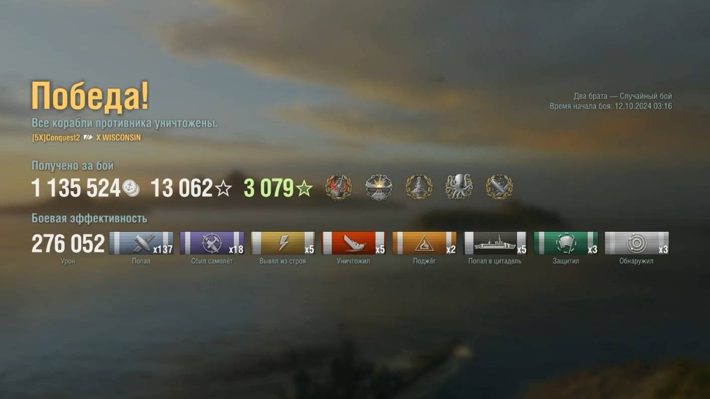 Линкор Wisconsin Игрок: Conquest2 (NA) Карта: Два брата - Случайный бой Урон: 276к Wisconsin - Линкор США 10 уровня