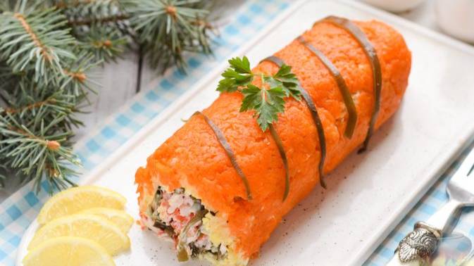 Аппетитный, нарядный и очень вкусный салат-рулет формируется по тому же принципу, что и закуска "Царский рулет", только в качестве начинки не красная рыба, а ламинария и крабовые палочки. Овощи предварительно отварим, затем всё измельчим, соберём салат слоями и свернём рулет. #СалатИзКрабовыхПалочек #СалатПраздничный #ХолодныеЗакуски