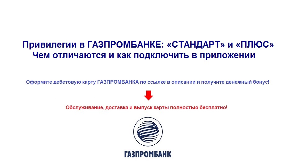 https://redirect-ssilka.blogspot.com/2024/05/blog-post_15.html - оформляйте дебетовую карту ГАЗПРОМБАНКА и получайте денежный бонус. Обслуживание, доставка и выпуск карты полностью бесплатно! http://zarab0t0k.ru/index/luchshie_debetovye_karty_year_goda_s_besplatnym_obsluzhivaem_bez_uslovij/0-772 - лучшие дебетовые карты года с бесплатным обслуживанием без условий. Обзорное видео про Привилегии в Газпромбанке. Чем отличаются «СТАНДАРТ» и «ПЛЮС», и как подключить в приложении банка. Пакет «ПЛЮС» будет выгоден тем клиентам банка, которые имеют или собираются открыть накопительный счёт или вклад. Остальные условия по привилегиям «СТАНДАРТ» и «ПЛЮС» одинаковые. Вы можете поблагодарить автора, отправив любую сумму на банковскую карту, Юmoney кошелек или по ссылке для приёма донатов: 5599002002914710 - банковская карта 410012277693273 - Юmoney кошелек https://donate.stream/donate_654b0d10b62cd Всем кто отправил – огромное спасибо! https://www.youtube.com/playlist?list=PL8YSlR-FMFzjuRlcQbnPv6xn2Da6--JVz – подкаст про Газпромбанк. Подписывайся на «Inter Net»: https://dzen.ru/internet2044 - мы в Яндекс Дзен. https://www.youtube.com/@internet2040 https://rutube.ru/channel/26377772/ https://vk.com/inter_net_dzen - группа Вконтакте. #газпромбанк #газпромбанкплюс #газпромбанкпривилегии #плюс #привилегии