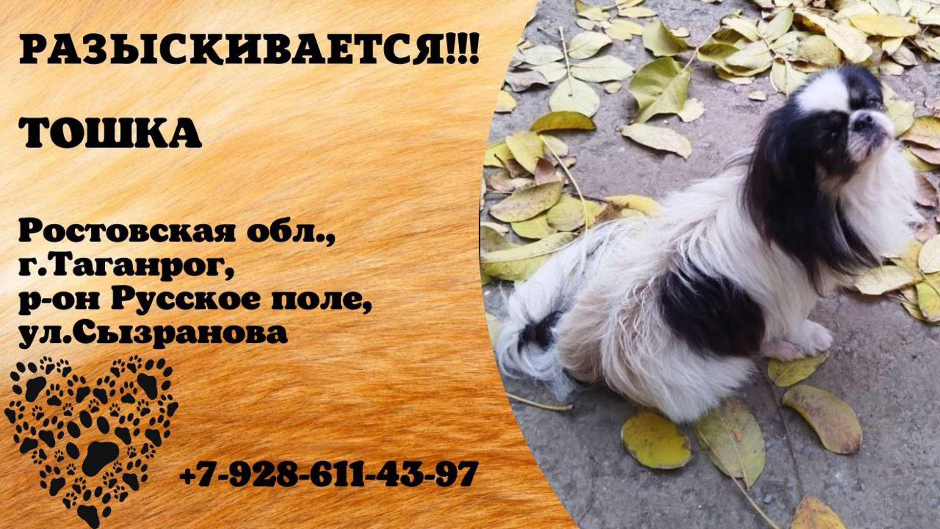 Ростовская Таганрог Пропала собака 03.03 Помогите найти нашего любимца! Район ,,Русское поле,,ул. Сызранова, гаражи возле м-на Лето. Пропал черно-белый пекинес по кличке «Тошка», 15 лет. Он очень дружелюбный и может отвлекаться на свое имя. Последний раз его видели в районе улицы Сызранова. Если вы видели Тошку или знаете, где он может быть, пожалуйста, свяжитесь с нами. Мы очень переживаем и хотим вернуть его домой. Вознаграждение гарантировано за любую информацию, которая поможет в поисках! Телефон для связи: +7 928 611‑43‑97 Пишите в вотсап. Инфо https://vk.com/wall-198815410_182584 #пропала_собака#таганрог#ростовская