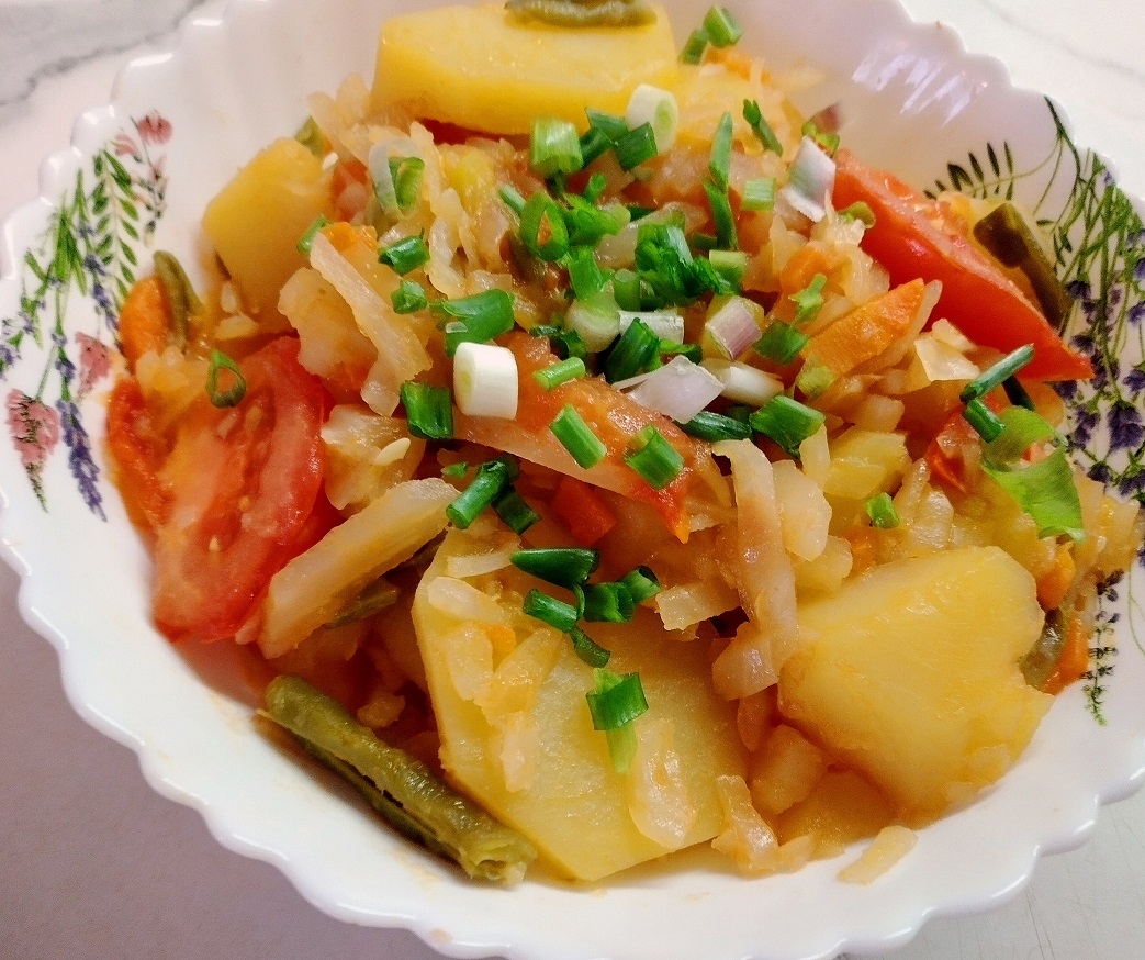 #Второеблюдо,#Еда,#Готовка Ингредиенты: Капуста - 1кг (нашинкованная), Картофель молодой - 1 кг. Огородник овощной. Ингредиенты: Капуста - 1кг (нашинкованная), Картофель молодой - 1 кг. Морковь - 1-2шт.,Перец болгарский - 1шт. Помидоры - 3шт., Кабачок - 1шт. Фасоль стручковая - 100гр. Лук репчатый - 2шт.,Лук зелёный Томатная паста - 2ст.ложки Масло растительное Вода кипячёная - 400 мл. Сахар - 1 ч.ложка, Соль по вкусу. Приготовление: Овощи нарезать. В разогретый казан налить масло и немного обжарить лук с морковью, посолить. Затем добавить томатную пасту, перемешать и отправить в казан капусту, налить стакан воды и тушить до полуготовности. Потом добавить перец , стручковую фасоль, сахар и обжарить 10 мин. Далее отправить кабачки, картошку и налить ещё стакан воды, тушить до готовности. Помидоры добавить за 10 минут до приготовления блюда. Ещё солить по вкусу. Украсить зелёным луком(или любой зеленью) Вкуснейший овощной Огородник готов! Приятного Аппетита!